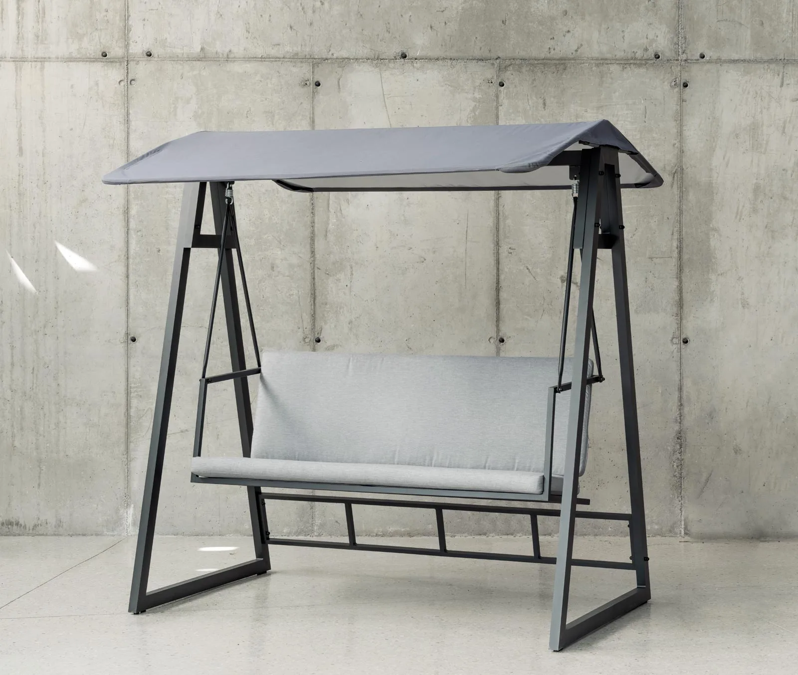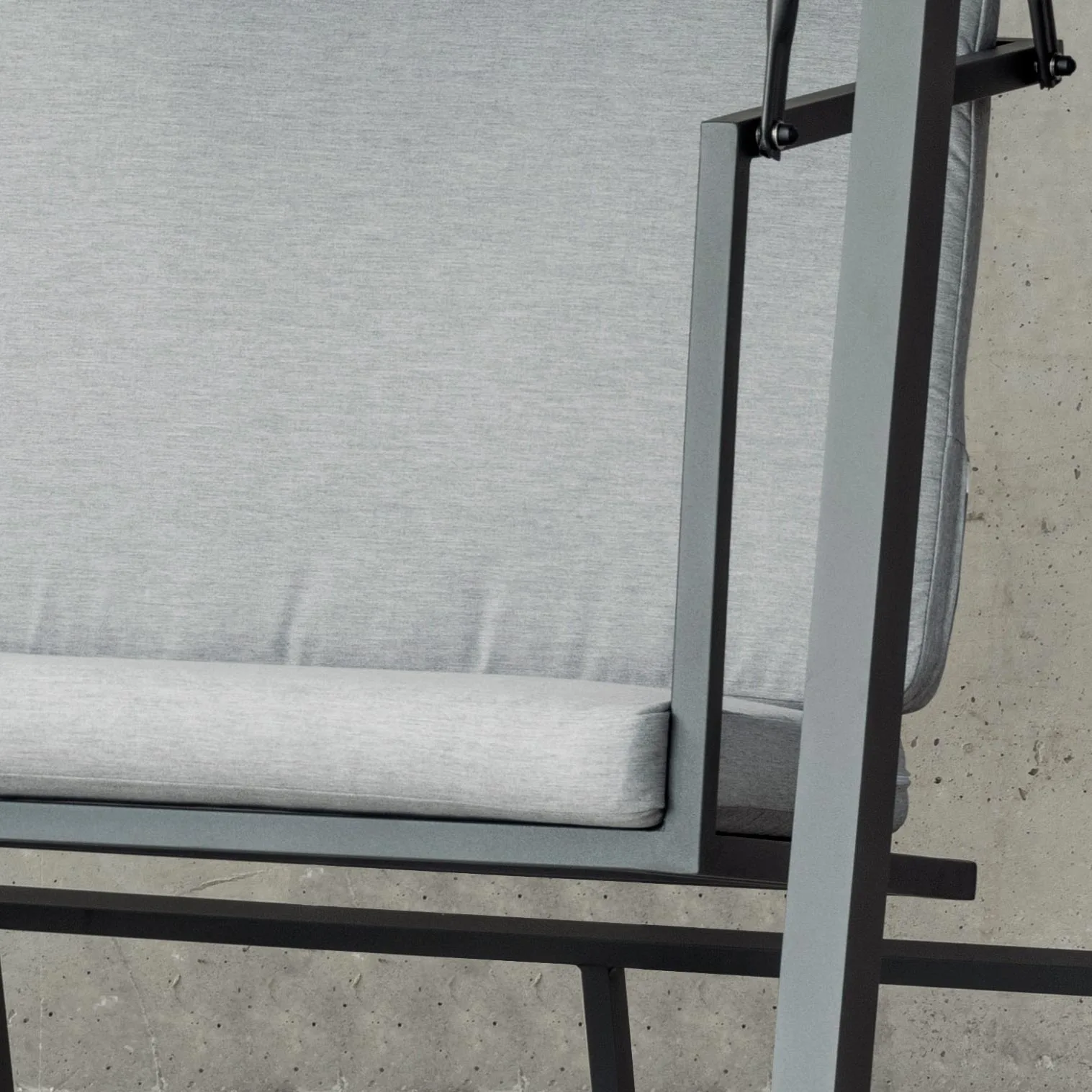En la fabricación de este balancín de terraza, se han utilizado las mejores materias primas que la hacen muy resistente y duradera. Estructura y uniones fabricadas en aluminio extrusado de alta calidad y no reciclado. Los tubos de aluminio que la forman están perfectamente lijados para eliminar cualquier imperfección o irregularidad en las juntas. Así mismo, dichos tubos están especialmente pulidos para abrir los poros del aluminio y facilitar la fijación de la pintura. Las patas llevan tacos para evitar rallar el suelo y reducir el ruido producido con el movimiento. Fabricamos la estructura en cuatro colores distintos; champagne, blanco y gris antracita.