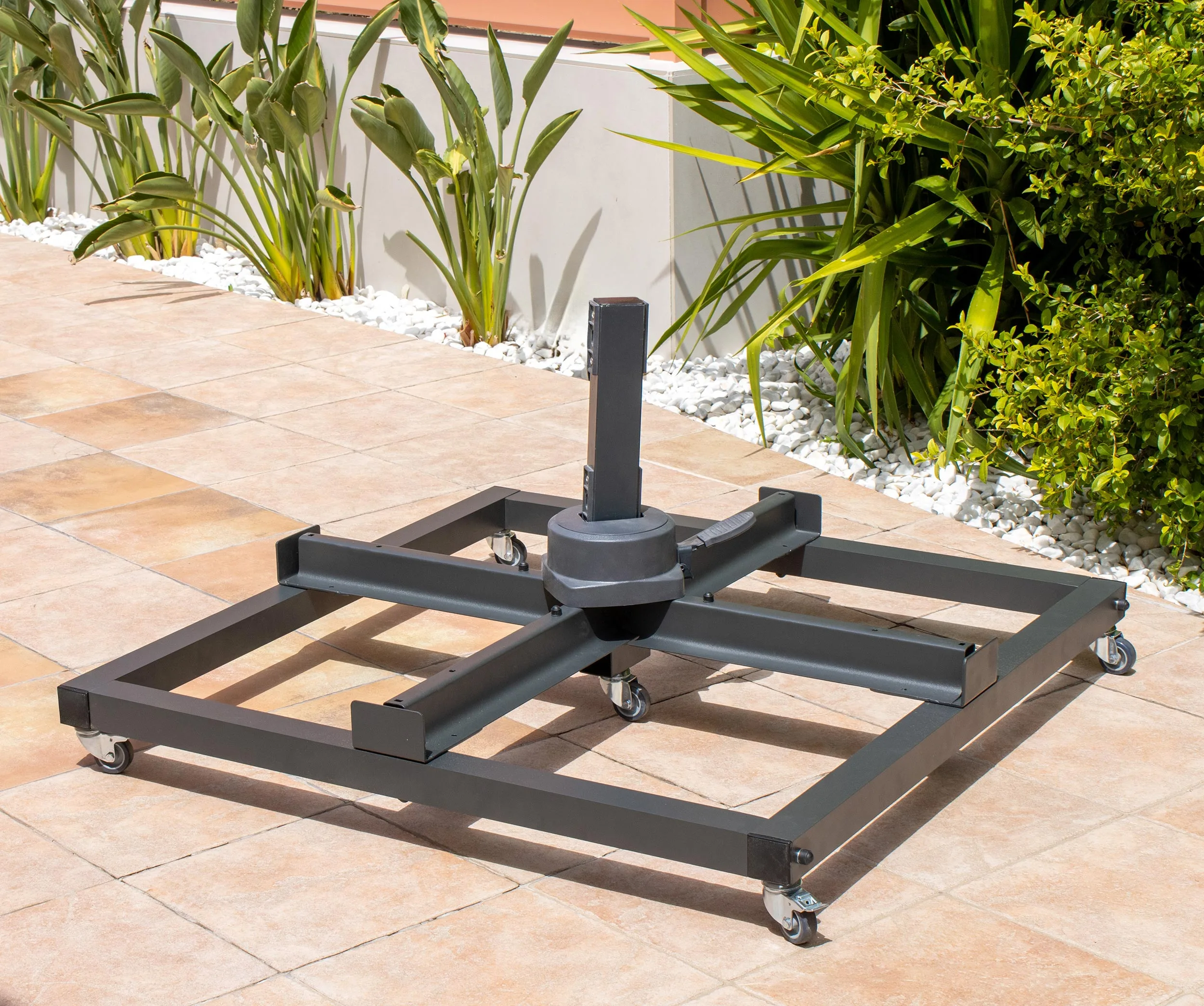 Esta base de parasol está diseñada para ofrecer máxima seguridad, incluso con parasoles grandes o en condiciones climáticas adversas. Su estructura en aluminio antioxidante no solo evita la corrosión, sino que garantiza una carga segura de hasta 200 kg, ideal para terrazas con vientos fuertes o zonas de alta actividad. Las ruedas reforzadas permiten ajustar la posición sin comprometer la estabilidad, asegurando que tu espacio exterior sea funcional y estéticamente impecable.