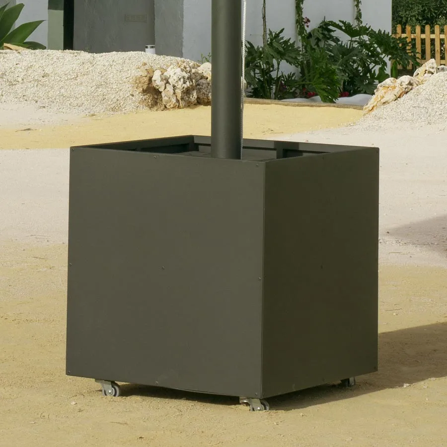 Sólida, estable y firme base rellenable con ruedas, que garantizará firmeza y estabilidad a tu parasol. Es fácil de mover y fijar gracias a sus ruedas giratorias y sistema de freno. Fabricada en aluminio, tiene la particularidad que puede ser rellenada con arena o chinarro.