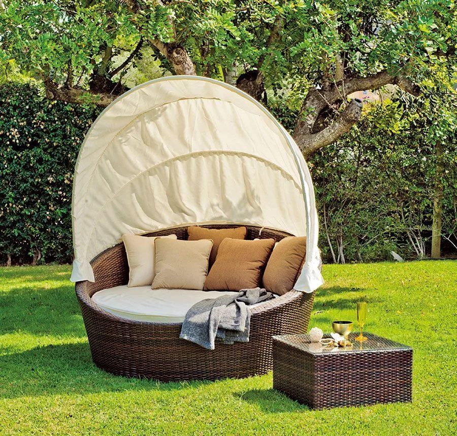 Elegante y funcional Cama Balinesa Redonda fabricada en ratán sintético marrón modelo Kamasutra, ideal para tus momentos de relax y descanso al aire libre frente al mar o alrededor de la piscina en compañía de tus familiares o amigos.