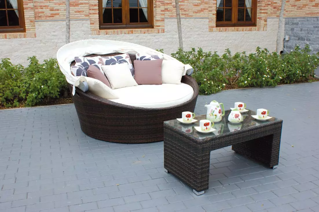 Elegante y funcional Cama Balinesa de ratán sintético en color marrón, ideal para tus momentos de relax y descanso al aire libre frente al mar o alrededor de la piscina en compañía de tus familiares o amigos.