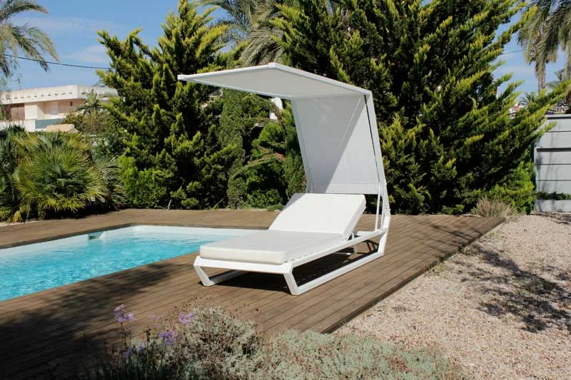 Esta cama está fabricada con estructura de aluminio reforzada y ligera en color blanco de gran calidad y de alta resistencia al salitre, rayas o golpes gracias a los procesos de cocción. Cuenta con respaldo multiposiciones, con toldo de textileno blanco y cojines desenfundables de 12 cm de acolchado con tapizado Everdry blanco especial para exterior e incluidos en el precio.