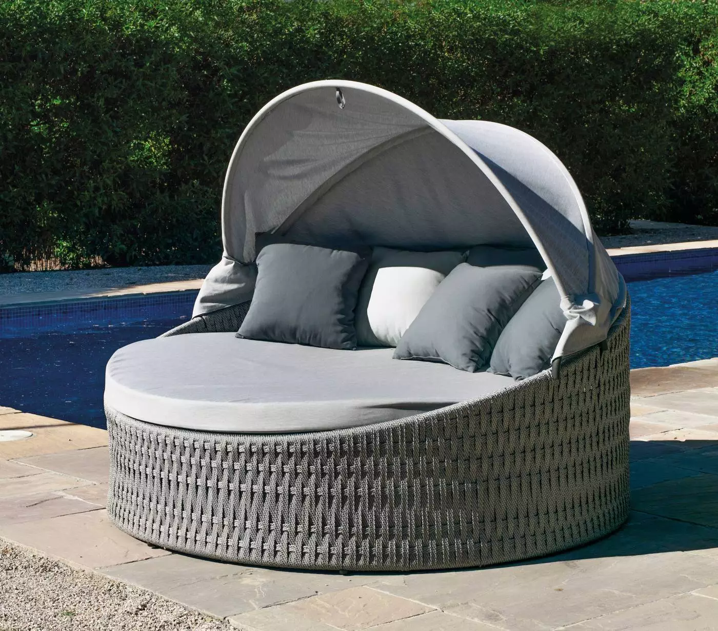 Elegante y funcional cama redonda de jardín fabricada en aluminio y cuerda trenzada, ideal para tus momentos de relax y descanso al aire libre frente al mar o alrededor de la piscina en compañía de tus familiares o amigos.