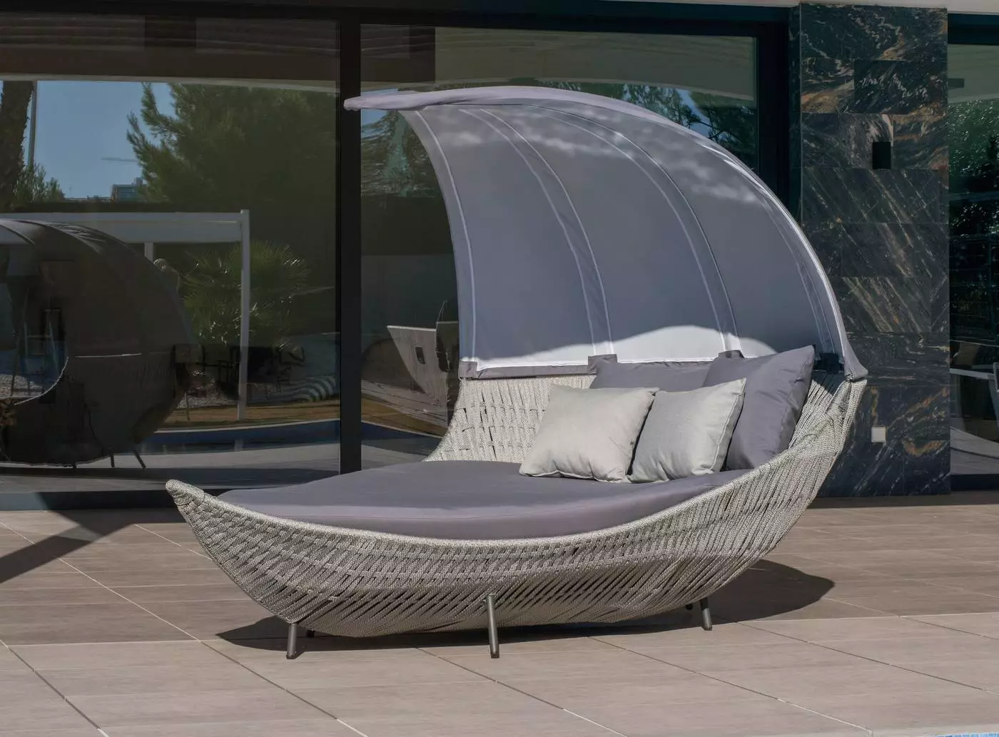 Os presentamos nuestra lujosa y espectacular cama de jardín con toldo de textilene y estructura de aluminio revestida con cuerda trenzada en varios colores, modelo Victory, ideal para tus momentos de relax y descanso al aire libre frente al mar o alrededor de la piscina en compañía de tus familiares o amigos.