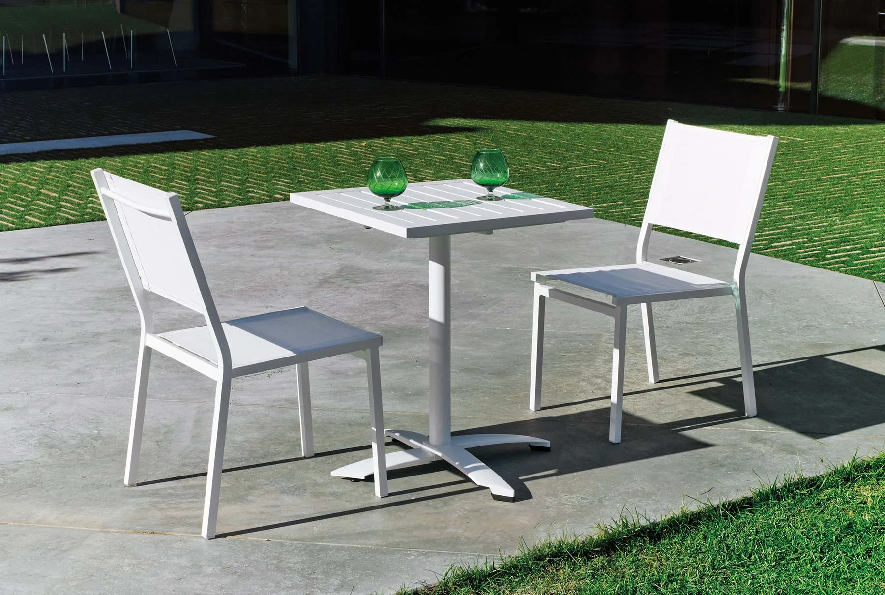 Estan disponibles la mesa cuadrada de exterior con dos tipos de tableros, uno es con lamas de aluminio y el otro con HPL.