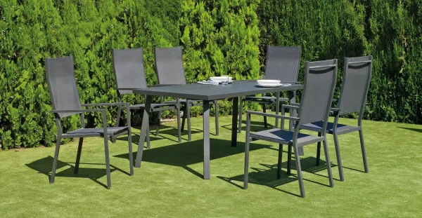 Nuestra mesa y 6 sillas de exterior son ideales para un estar rodeado de familiares o amigos. Este juego de jardín con 6 sillas está fabricado en aluminio y textileno. Ambos componentes son perfectos para el uso al exterior. Las estructuras de aluminio aseguran durabilidad y facilidad de mantenimiento, así como un seguro ante las inclemencias climáticas.
