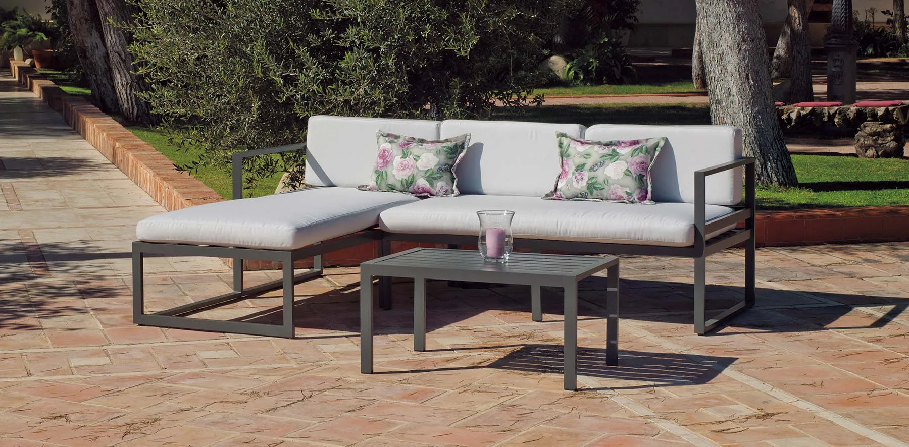 Su limpio y original diseño, otorgan a este conjunto de exterior modernidad y elegancia. Especialmente diseñado para soportar las condiciones adversas como el sol y la lluvia, así como los rigores del uso diario. Fabricamos la estructura en seis colores distintos; champagne, marrón, negro, plata, blanco y gris antracita.