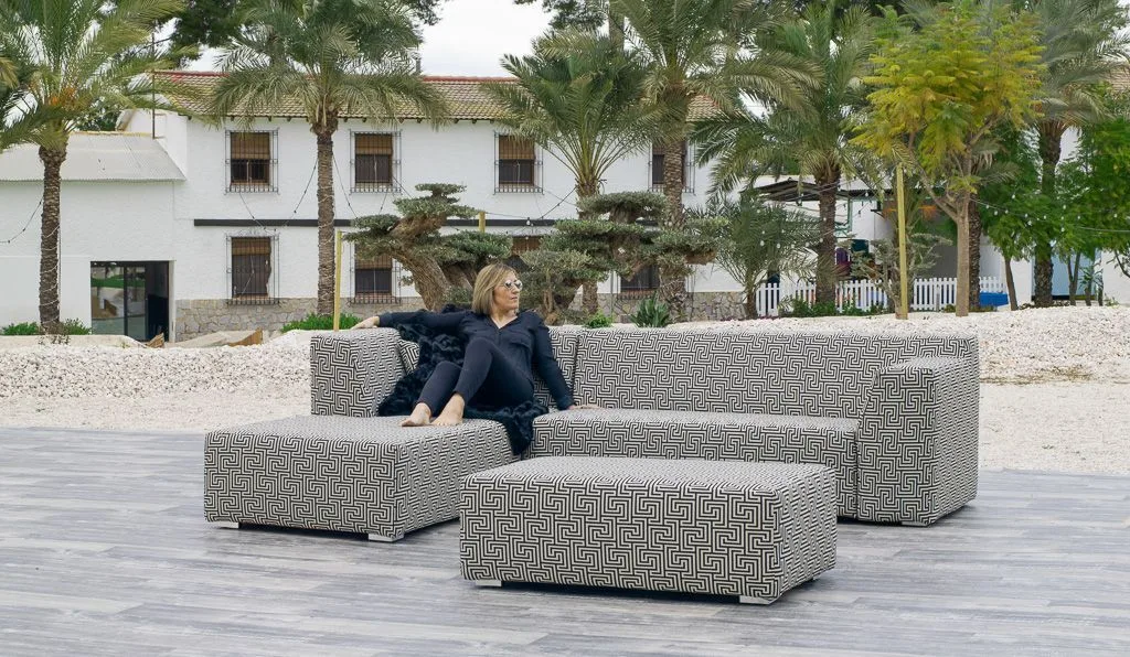 - Chaiselongue para 3/4 plazas con estructura de aluminio. Asientos y respaldos tapizados con Dralón Lux. dividida en dos módulos separables: