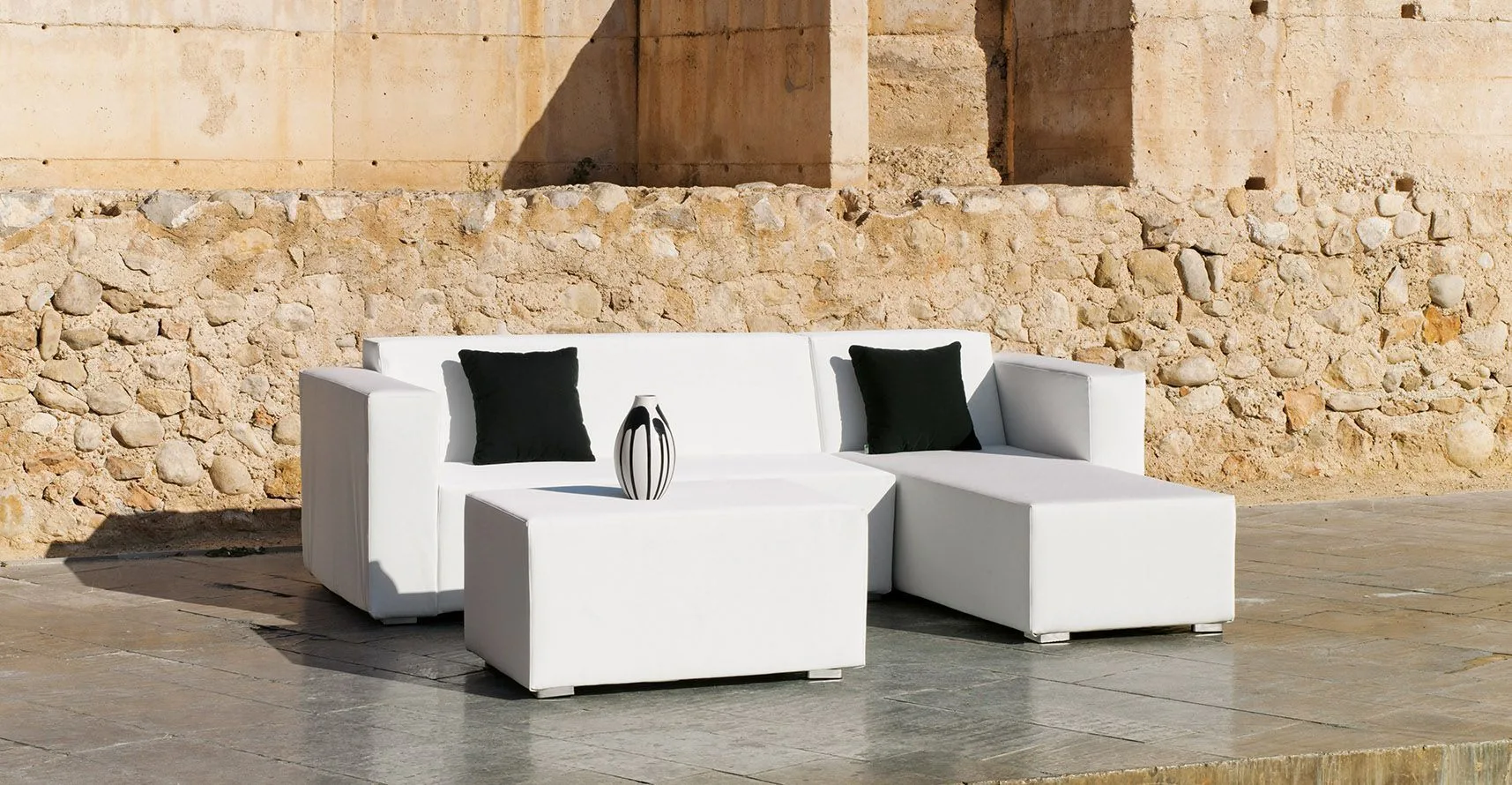 Lujoso conjunto chaiselongue con estructura de aluminio y tapizado en piel náutica impermeable color blanco compuesto por 1 confortable chaiselongue, 1 sofá de 2 plazas, 1 reposapiés y una cómoda mesa baja de centro.