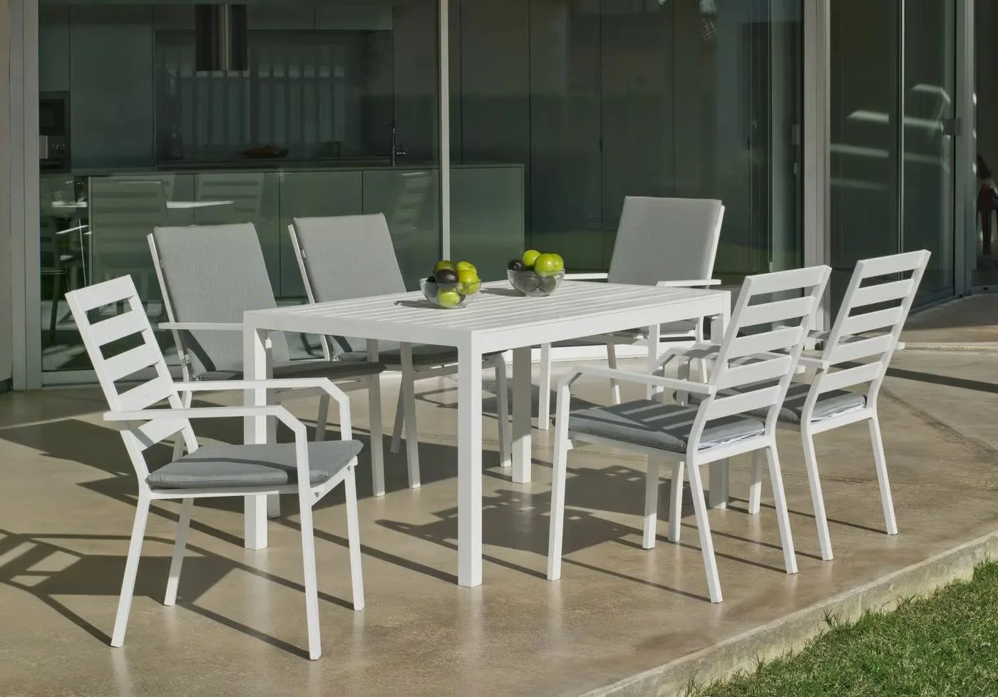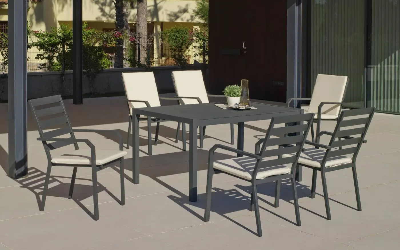 Su limpio y original diseño, otorgan a este conjunto de exterior modernidad y elegancia. Especialmente diseñado para soportar las condiciones adversas como el sol y la lluvia, así como los rigores del uso diario. Fabricamos las estructuras en tres colores distintos; champagne, blanco y gris antracita.