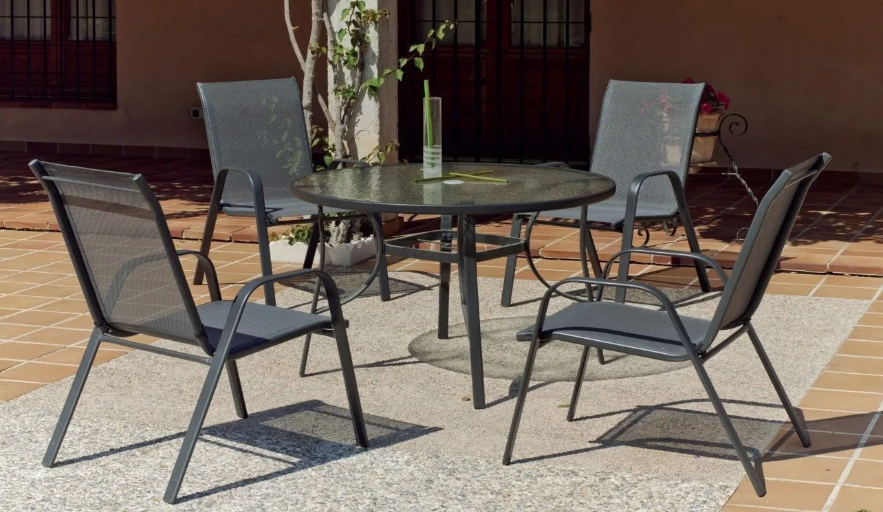 Si estás buscando un conjunto de comedor para tu terraza que combine estilo, elegancia y durabilidad, no puedes perderte este conjunto de mesa redonda de acero y cristal templado con 4 sillas para jardín de acero. Con su diseño moderno y sofisticado, este conjunto se ha convertido en la opción perfecta para aquellos que buscan crear un ambiente acogedor y elegante en sus espacios al aire libre.