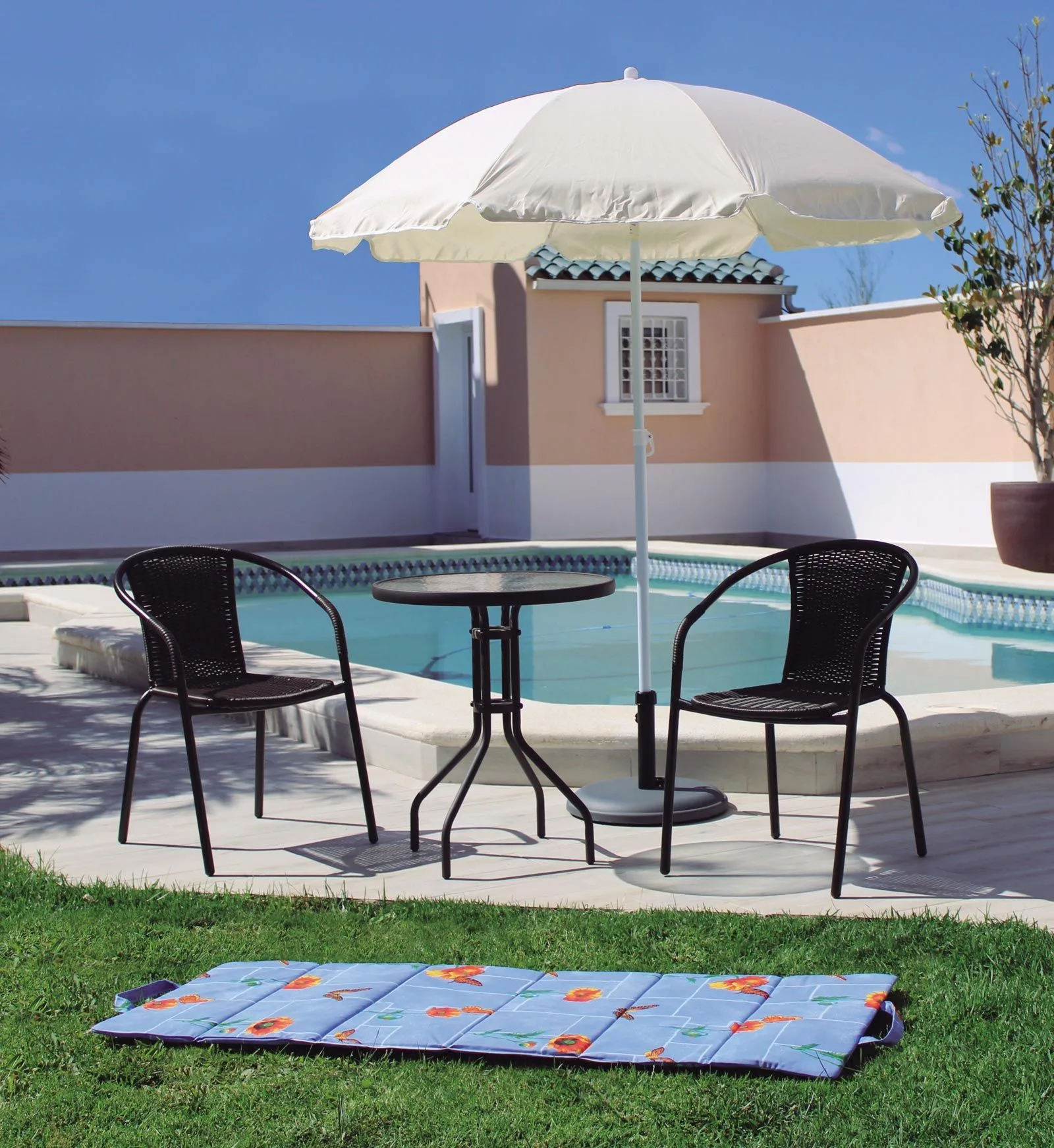 Este conjunto de piscina está diseñado para brindarte la mejor experiencia día en tu jardín. Las sillas son cómodas y tienen un diseño elegante que se adapta perfectamente a cualquier entorno. La mesa es lo suficientemente grande como para colocar bebidas y alimentos, mientras que la sombrilla proporciona la sombra necesaria para protegerse del sol.