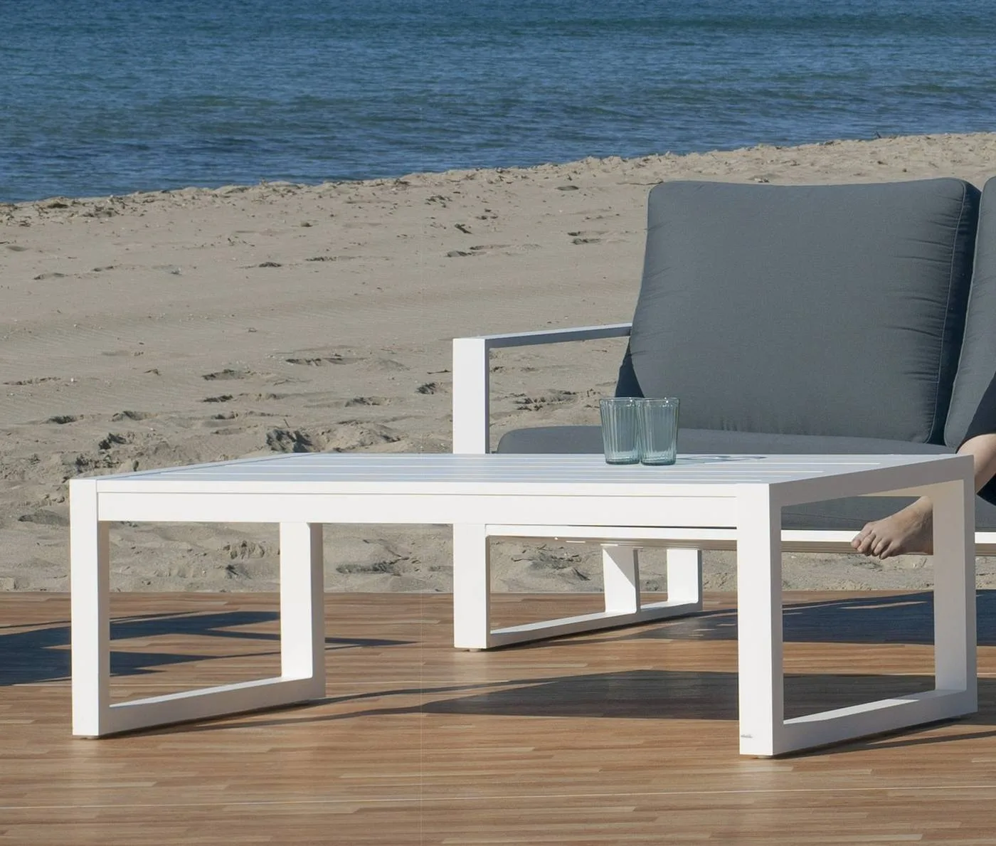 - 1 Mesa de centro de aluminio. Dimensiones (Ancho-Fondo-Alto): 120 x 65 x 40 H cm.