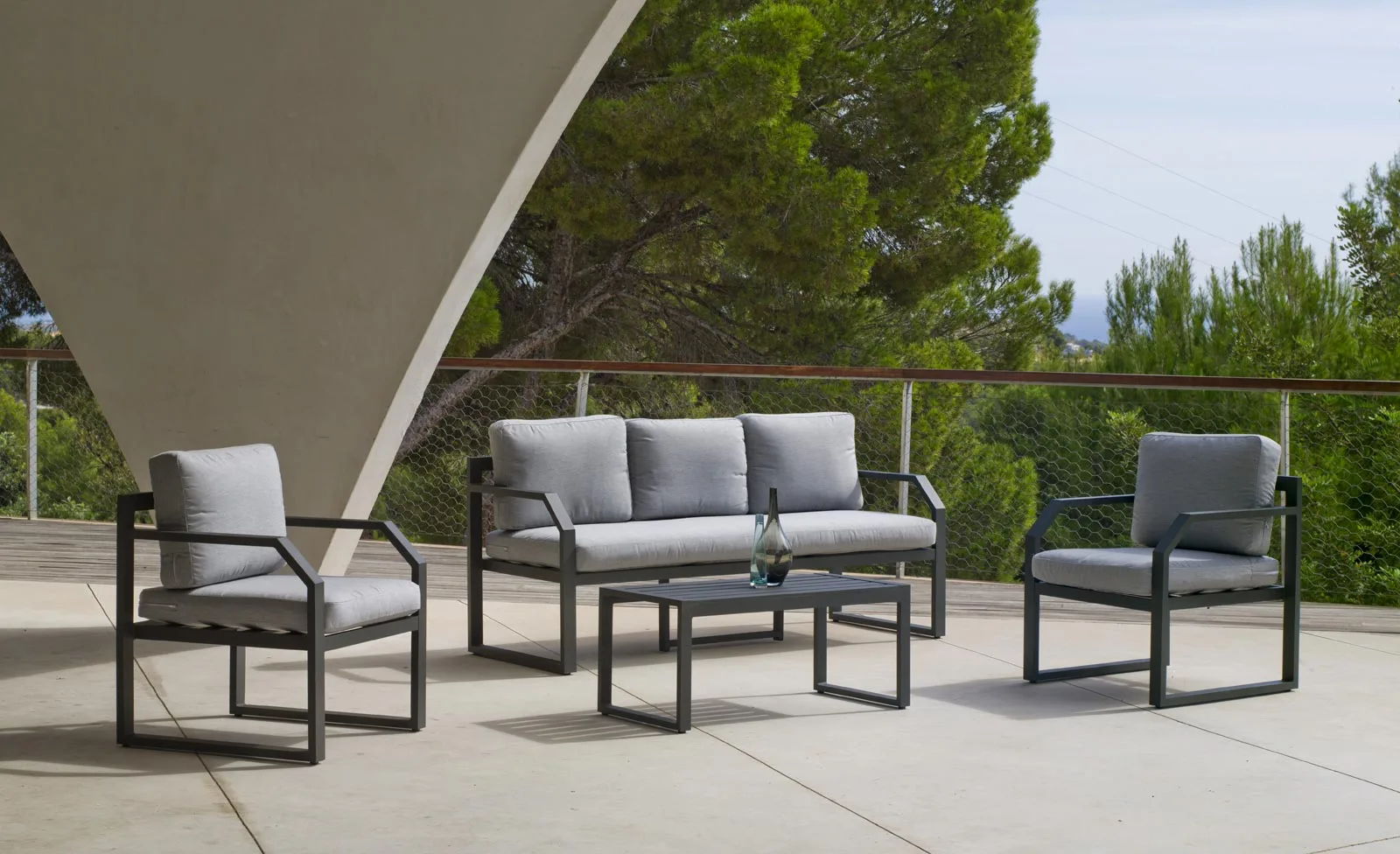 Este conjunto de exterior es una excelente opción para quienes buscan relajarse y disfrutar del aire libre con estilo. El conjunto incluye un cómodo sofá de 3 plazas, dos sillones y una mesa rectangular de aluminio a juego. Es ideal para todo tipo de exteriores, desde jardines hasta terrazas y está diseñado para soportar las condiciones climáticas más exigentes. El material de aluminio lo hace resistente a la lluvia, al viento y al sol, lo que significa que no tendrás que preocuparte por su deterioro a corto plazo.