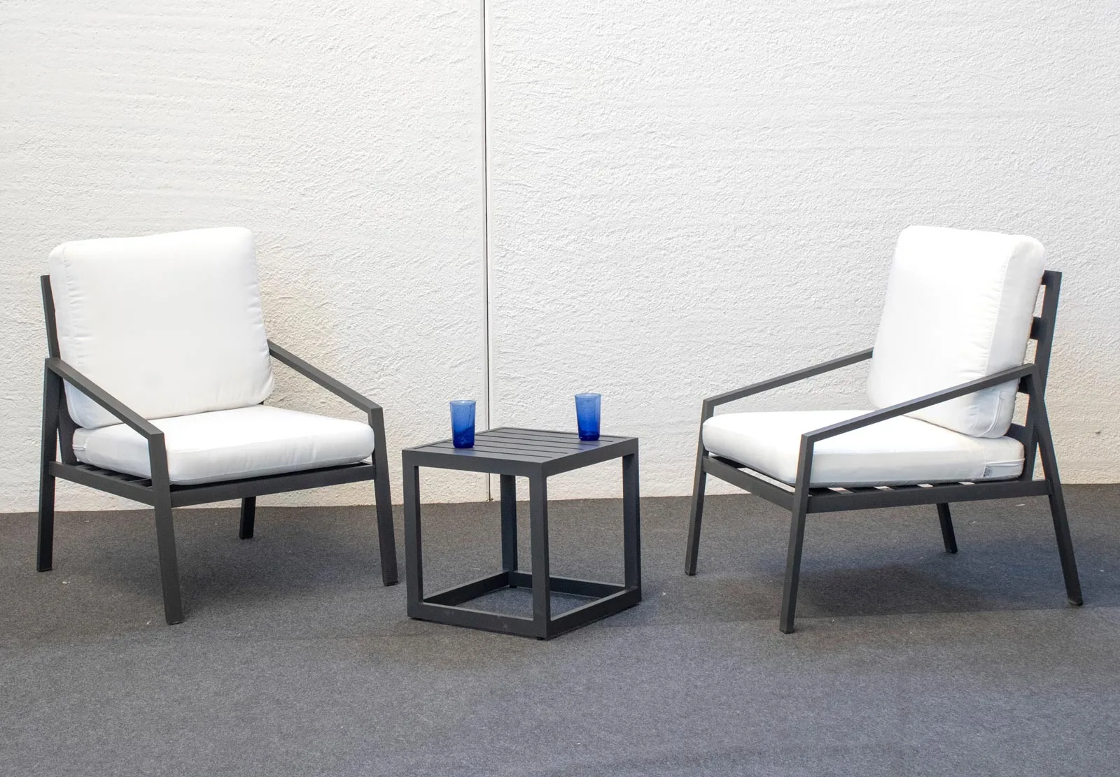 - 1 Mesa de centro de aluminio Alba. Dimensiones (Ancho-Fondo-Alto): 45 x 45 x 45 cm.
