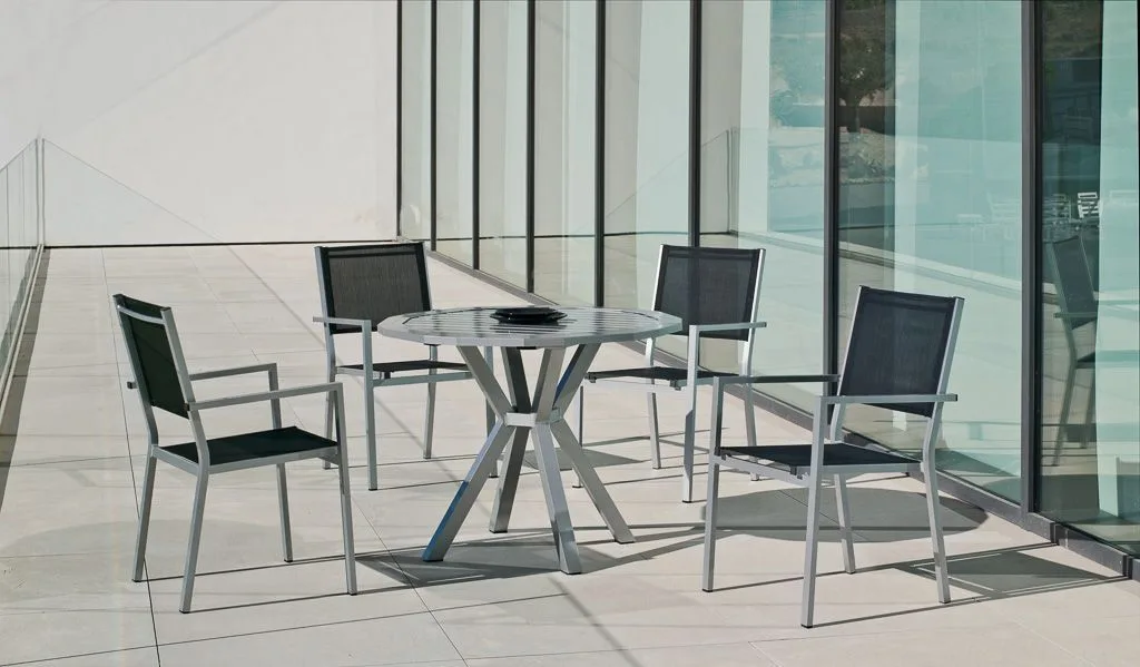 Las sillas que acompañan a esta mesa son igualmente impresionantes. Fabricadas en aluminio, poseen una estructura sólida pero ligera que garantiza su durabilidad a lo largo del tiempo. Los asientos y respaldos están confeccionados con textilene, un material resistente y transpirable que brinda la máxima comodidad. La elección del textilene no solo agrega un toque de modernidad al conjunto, sino que también garantiza una experiencia de asiento fresca y cómoda, incluso en los días más calurosos.