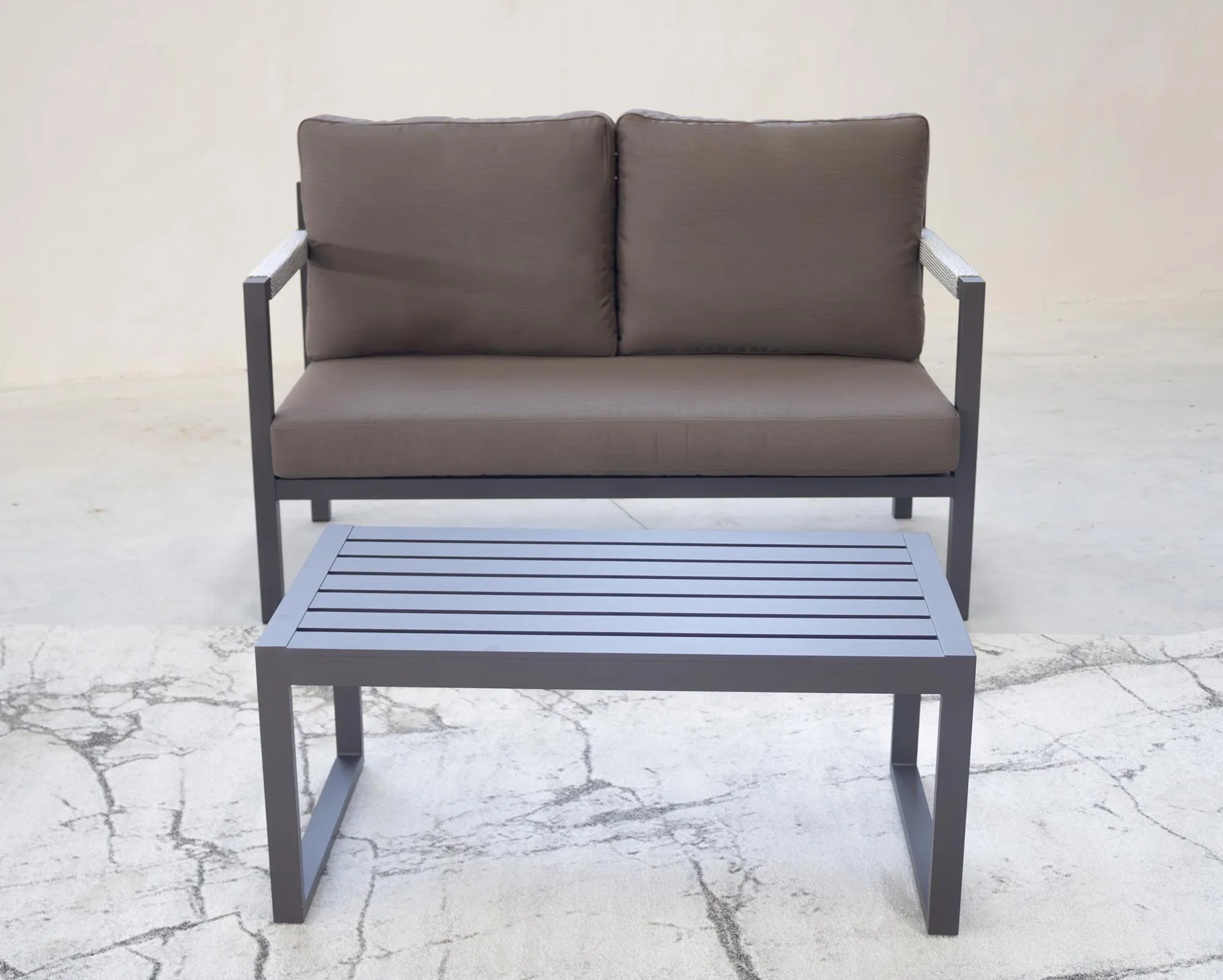 El conjunto de jardín forrado con cuerda trenzada y estructura de aluminio es la elección perfecta para quienes buscan combinar estilo y funcionalidad en su espacio al aire libre. La cuerda trenzada, disponible en varios colores, se integra armoniosamente con la estructura de aluminio de alta calidad, ofreciendo una estética moderna y atractiva que se adapta a cualquier estilo decorativo. Con acabados del aluminio en seis colores distintos, puedes personalizar este conjunto para que se ajuste perfectamente a tu entorno.