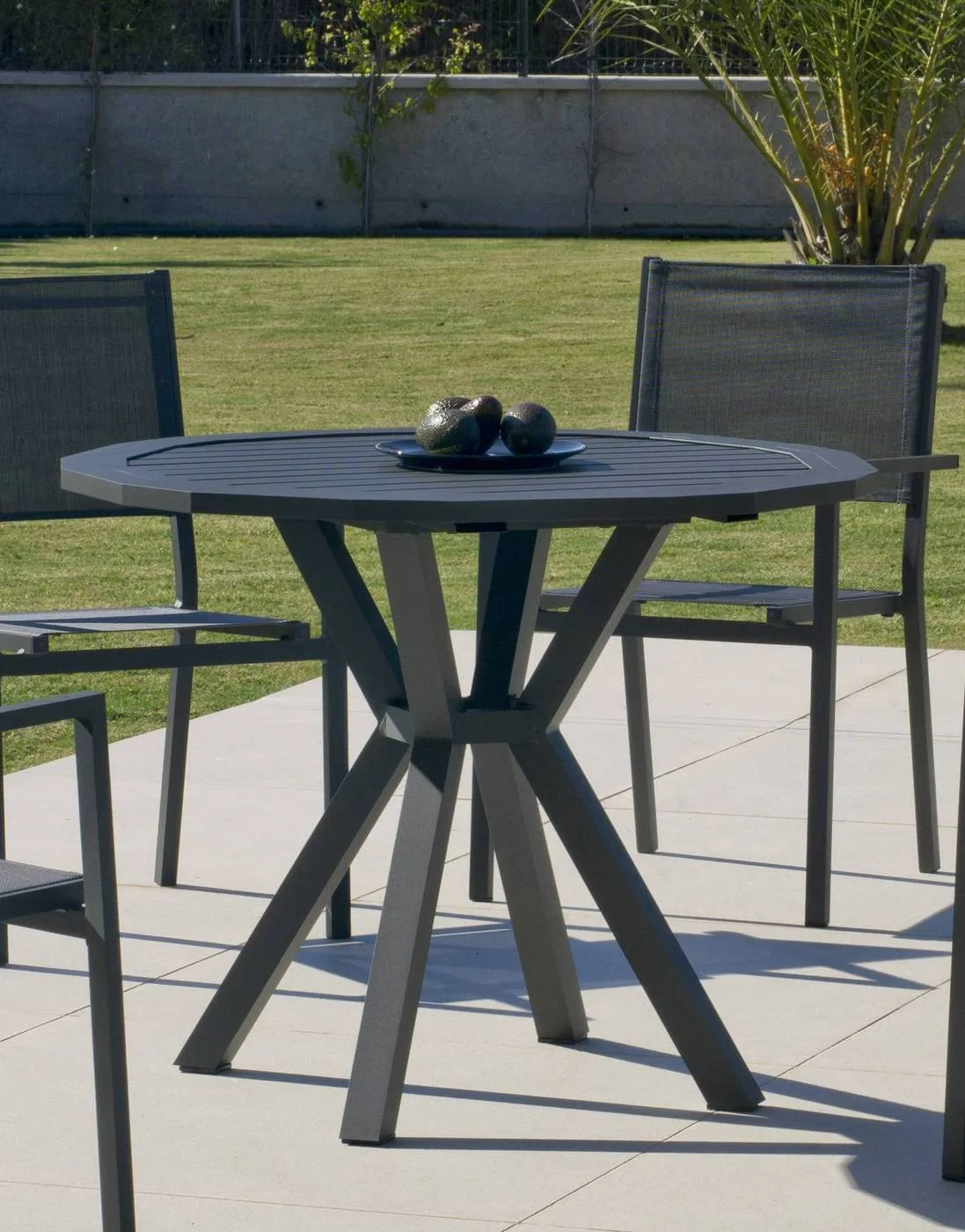 - 1 Mesa hexagonal de aluminio modelo Baracoa. Dimensiones (Ancho-Fondo-Alto): 100 x 100 x 77 cm.