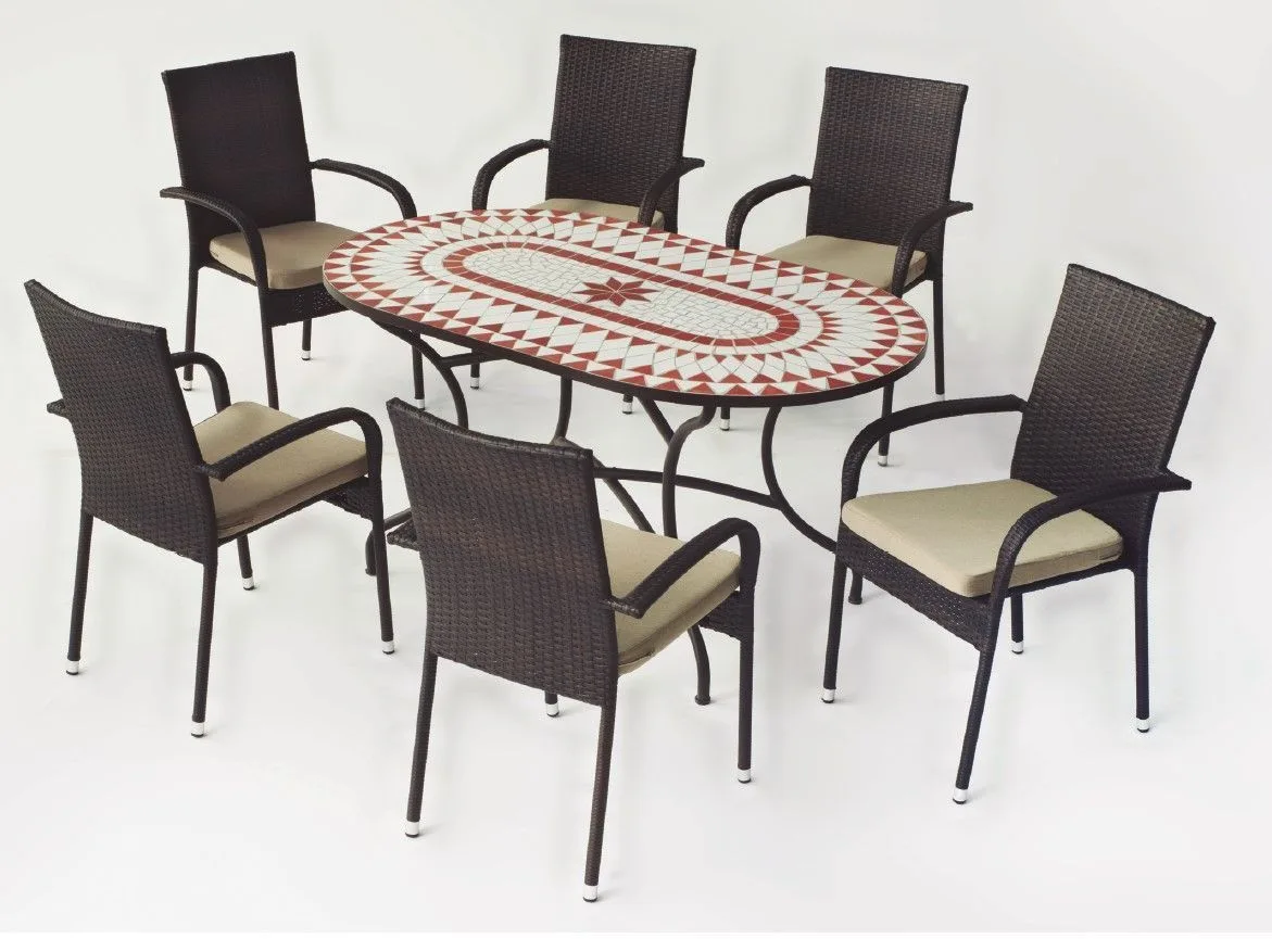 Os presentamos este práctico conjunto compuesto por una mesa mosaico ovalada de 150 cm. de diámetro y 6 sillas apilables de ratán sintético, ideal para jardín o terraza de pequeñas dimensiones.