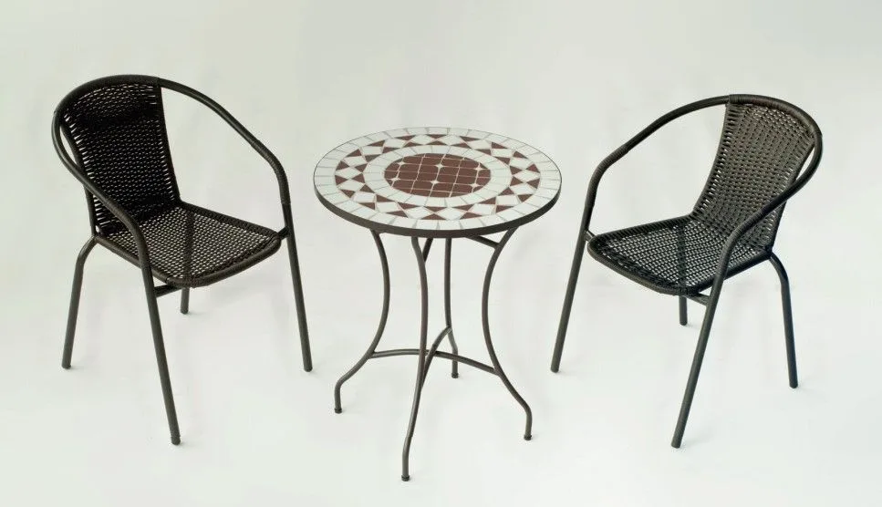 Os presentamos este práctico conjunto compuesto por una mesa mosaico redonda de 60 cm. de diámetro y 2 sillas apilables de ratán sintético, ideal para jardín o terraza de pequeñas dimensiones.