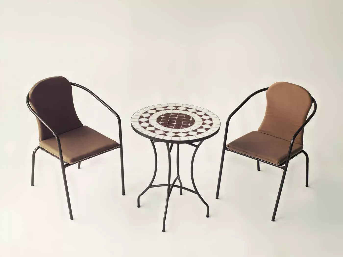 La estructura de esta mesa y de las sillas que lo acompañan es de acero forjado, con menos porosidad y mayor resistencia que cualquier otro tipo de acero. El tablero de mosaico cerámico es resistente a la humedad y al calor.
