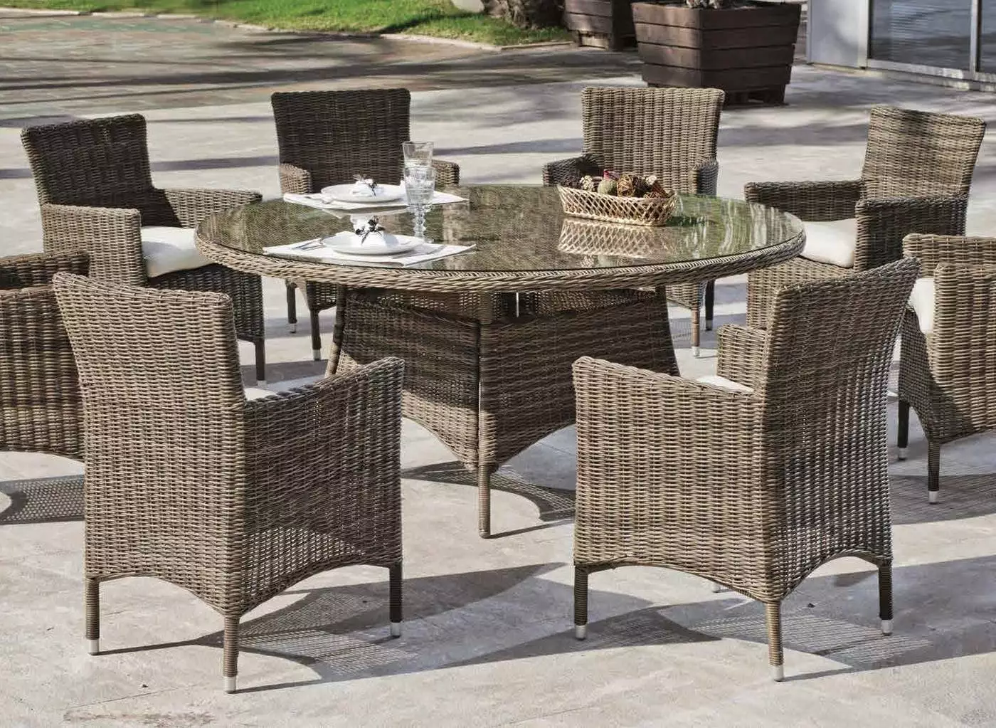 Precioso conjunto de mesa redonda y 6 sillones de ratan marrón compuesto por una mesa de jardín de ratán de 170 cm. de diámetro con cristal templado y 6 cómodos sillones de ratan para exterior. Una opción perfecta para cualquier tipo de terraza o jardín.