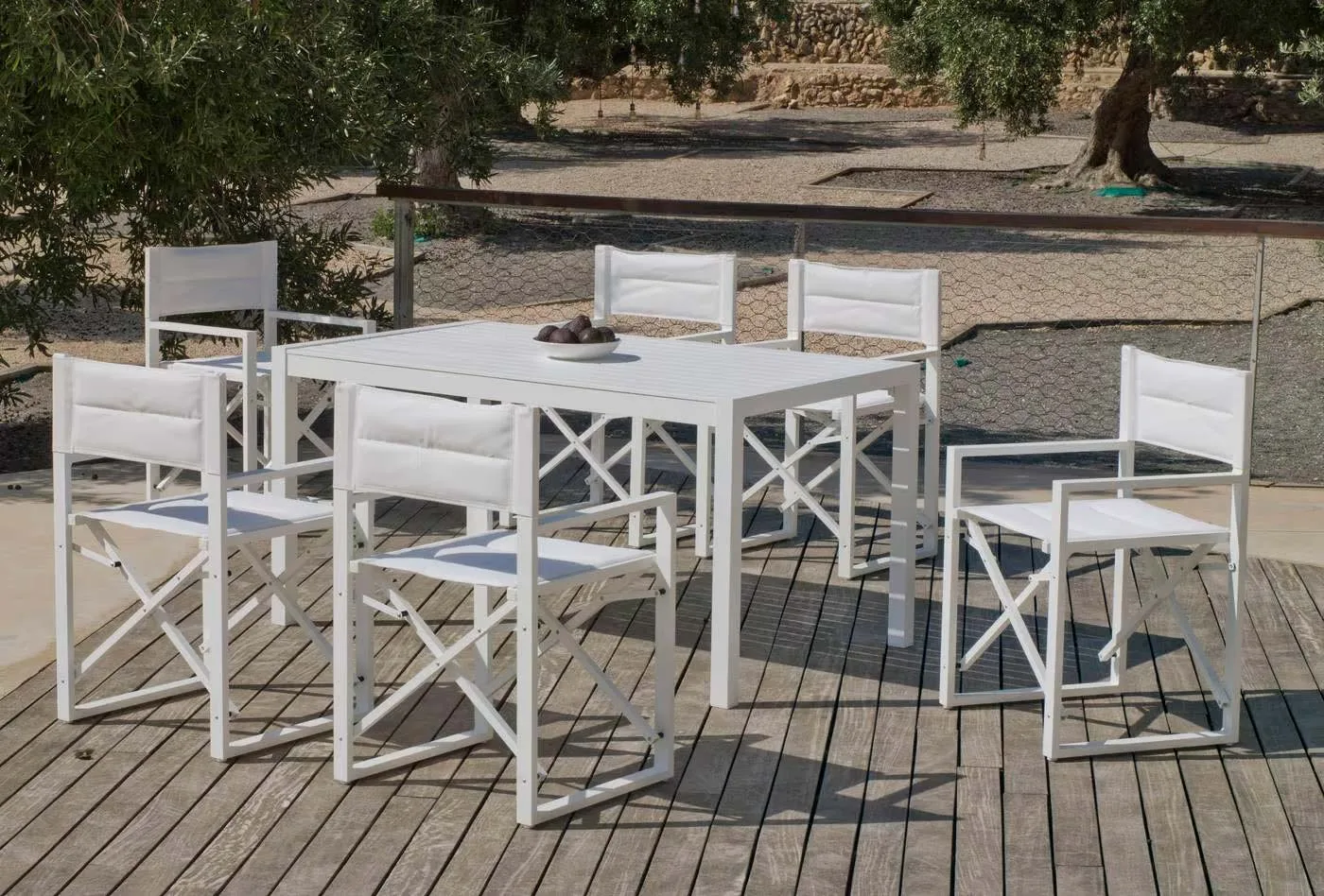 Las cuatro sillas de director incluidas en este conjunto ofrecen asientos cómodos en textilene acolchado para tus momentos de relajación al aire libre. Con respaldos altos y reposabrazos bien proporcionados, estas sillas no solo son atractivas a la vista, sino que también brindan un apoyo óptimo para disfrutar de largas conversaciones, lecturas placenteras o simplemente para contemplar la naturaleza.