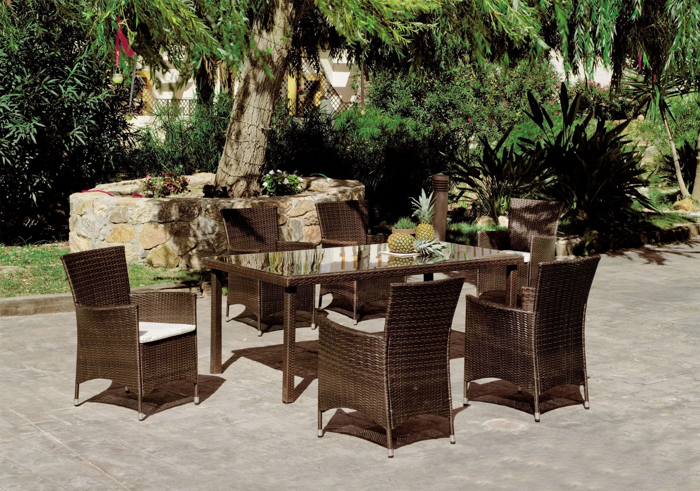 Elegante conjunto de muebles de ratán de la mejor calidad envuelto en acero que imita el color y textura de muebles de ratán natural. ¡Consigue el tuyo ahora! Incluye 6 fantásticos sillones y una práctica mesa de comedor con cristal templado de 150 x 90 cm.
