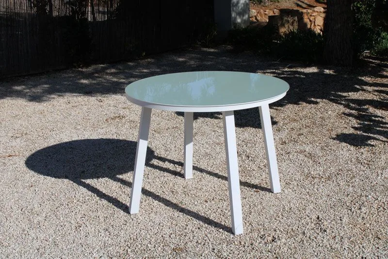 - 1 Mesa redonda de aluminio modelo California. Dimensiones (Diámetro-Alto): 80 x 77 cm.