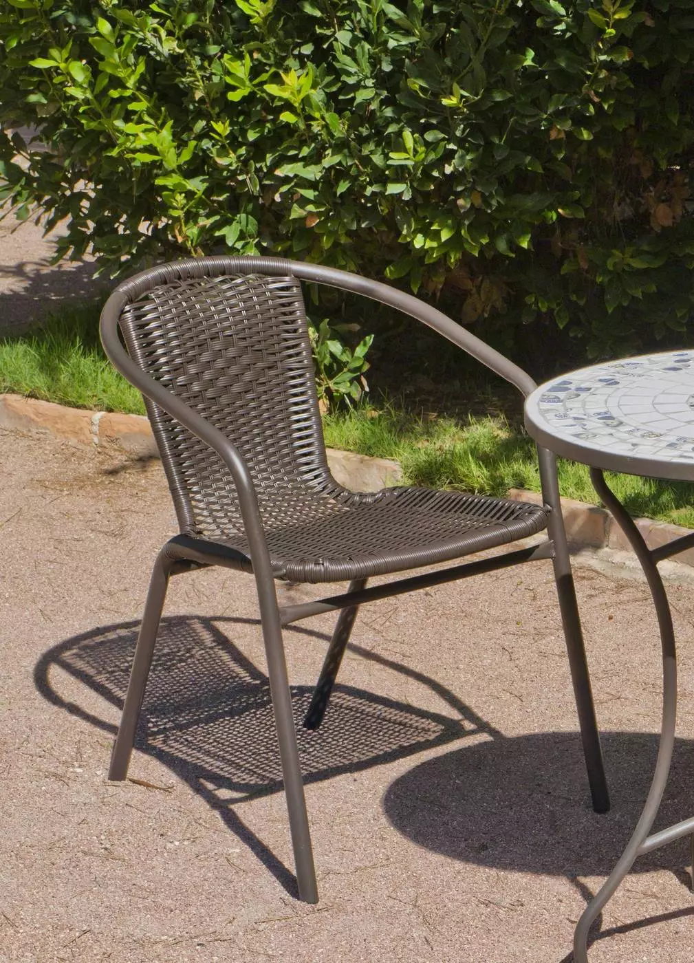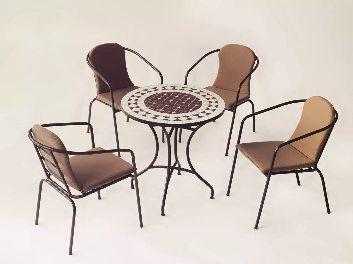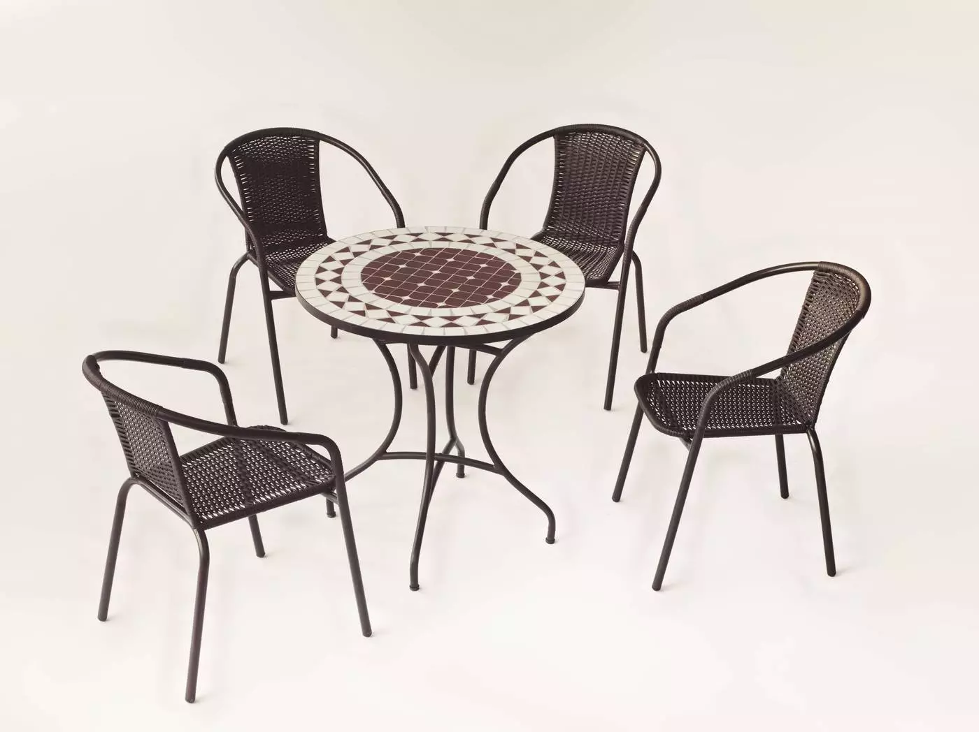 Os presentamos este práctico conjunto compuesto por una mesa mosaico redonda de 75 cm. de diámetro y 4 sillas apilables de ratán sintético, ideal para jardín o terraza de pequeñas dimensiones.