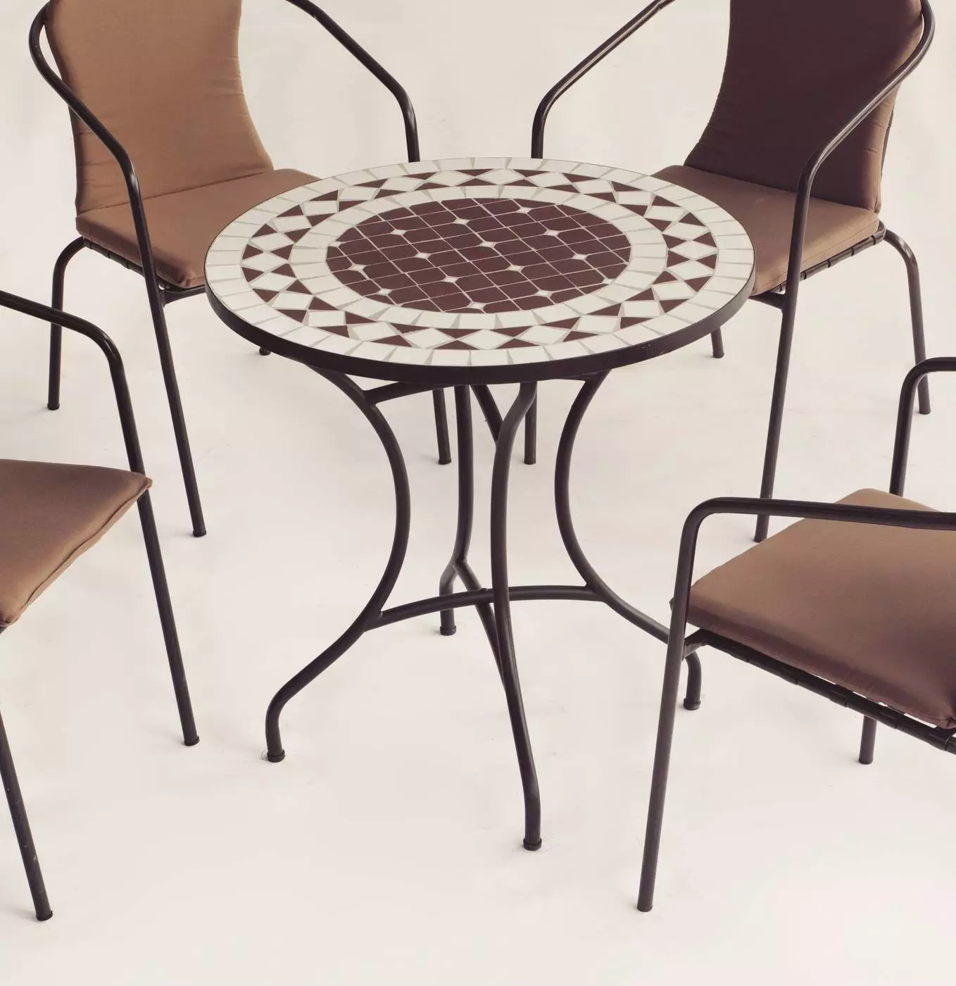 La estructura de esta mesa y de las sillas que lo acompañan es de acero forjado, con menos porosidad y mayor resistencia que cualquier otro tipo de acero. El tablero de mosaico cerámico es resistente a la humedad y al calor.