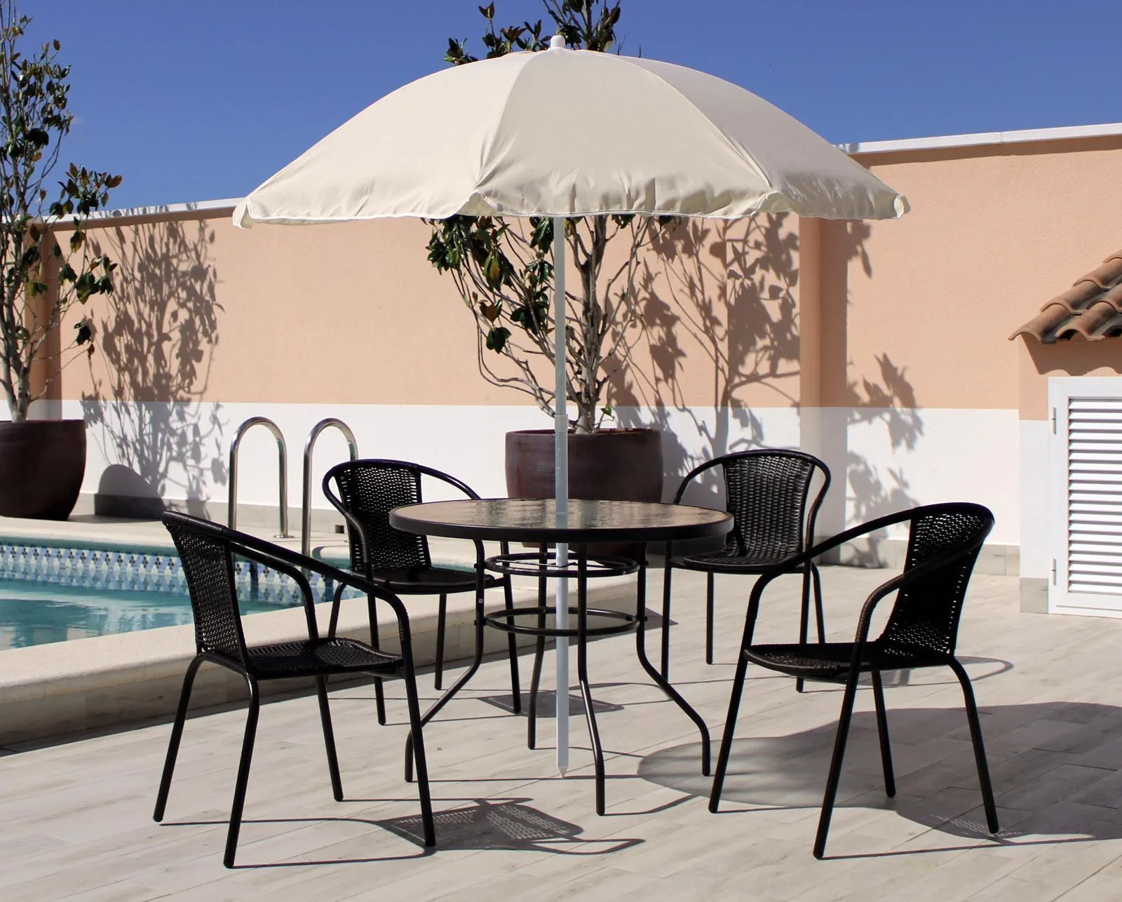 Nuestro conjunto de piscina está hecho con materiales de alta calidad que aseguran su durabilidad y resistencia. Las sillas y la mesa están hechas de acero resistente y están recubiertas con pintura en polvo resistente a la intemperie para evitar la oxidación. La sombrilla está fabricada con tela resistente a los rayos UV para protegerlo del sol.