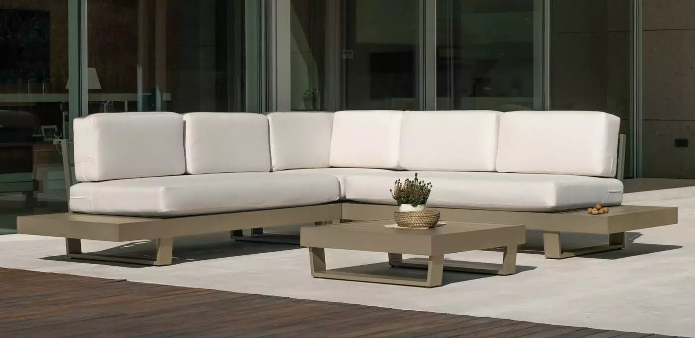 En la fabricación de este conjunto rinconera grande para exterior se han utilizado las mejores materias primas que la hacen muy resistente y duradera. Estructura y uniones fabricadas en aluminio extrusado de alta calidad y no reciclado. Los tubos de aluminio que la forman están perfectamente lijados para eliminar cualquier imperfección o irregularidad en las juntas. Así mismo, dichos tubos están especialmente pulidos para abrir los poros del aluminio y facilitar la fijación de la pintura. Las patas llevan tacos para evitar rallar el suelo y reducir el ruido producido con el movimiento.