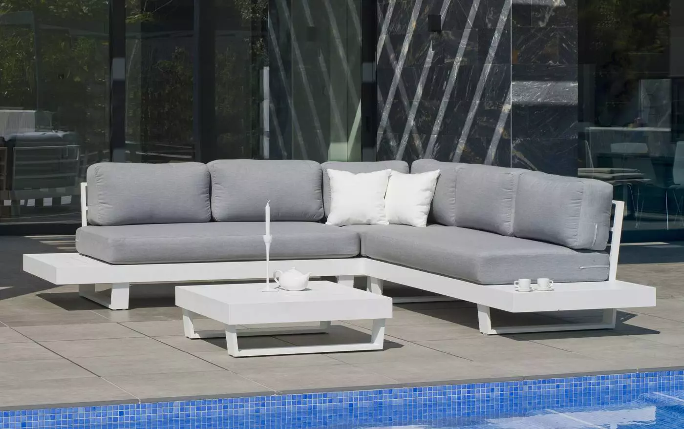 Su limpio y original diseño, otorgan a esta rinconera xxl de jardín modernidad y elegancia. Especialmente diseñado para soportar las condiciones adversas como el sol y la lluvia, así como los rigores del uso diario. Fabricamos la estructura en cinco colores distintos; blanco, gris antracita, plata, bronce y champán. Si prefieres este set con mesa alta, pásate a ver nuestro conjunto rinconera Menfis 8.