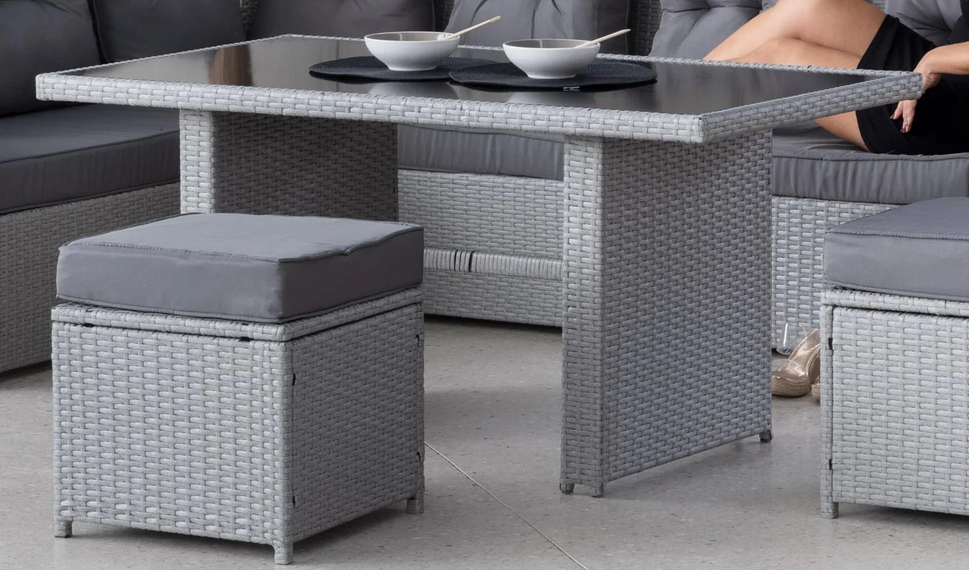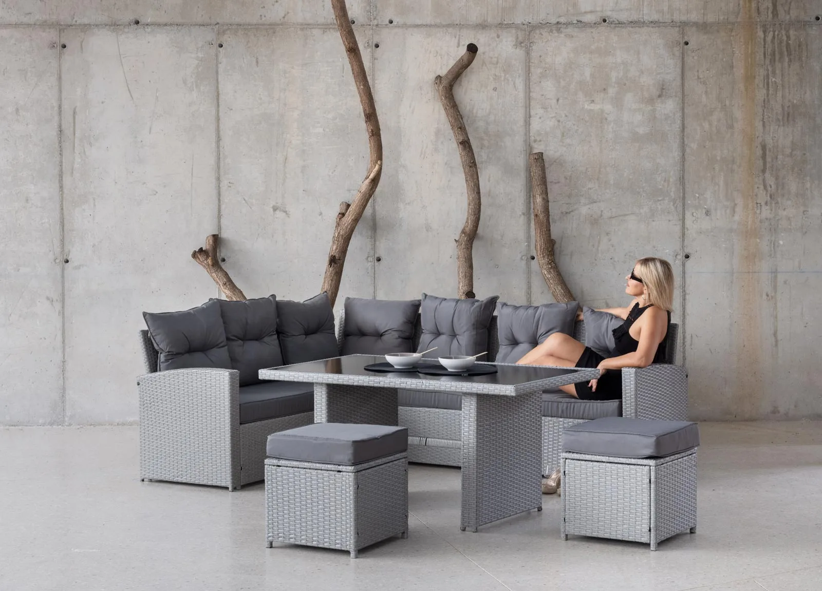 ¿Buscas una solución de rinconera elegante y cómoda para tu sala de estar o espacio al aire libre? Te presentamos este magnífico conjunto de sofá rinconera de ratán gris Vernis, que no solo se caracteriza por brindar amplios asientos para ti y tus invitados, sino que el material con que está fabricado es resistente a la intemperie y fácil de limpiar, lo que lo convierte en el complemento perfecto para cualquier espacio al aire libre. Y con su diseño elegante y moderno, este juego de sofás rinconera seguramente mejorará la apariencia de cualquier jardín o salón en el que se coloque.