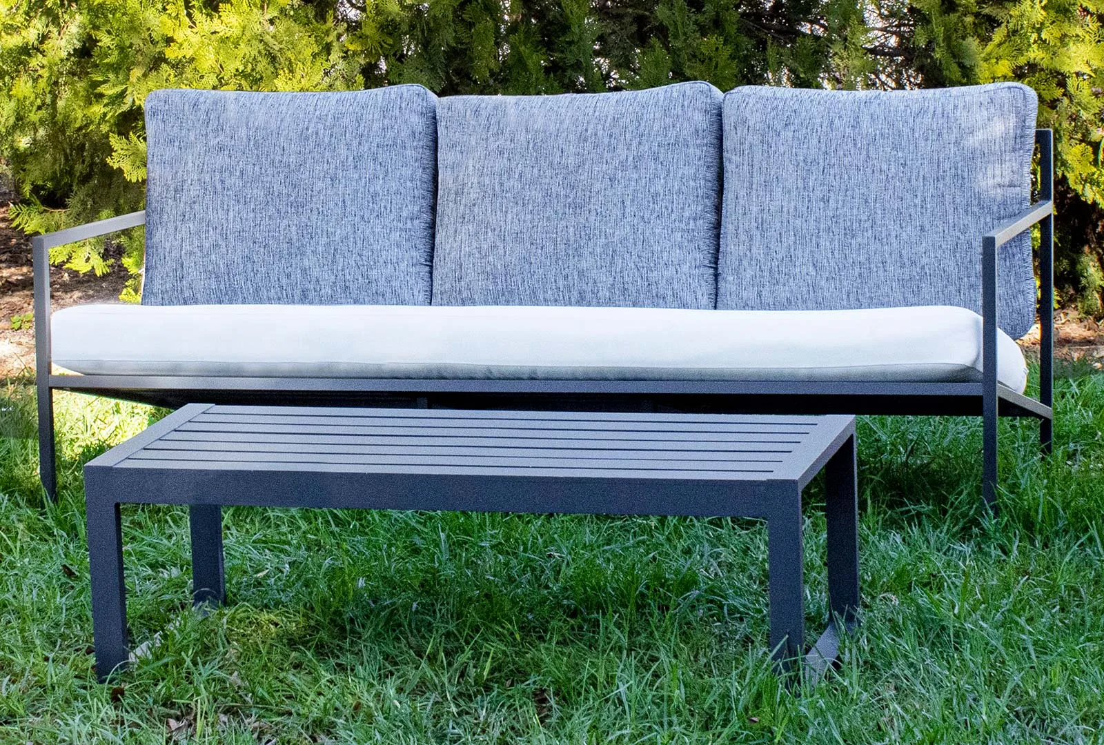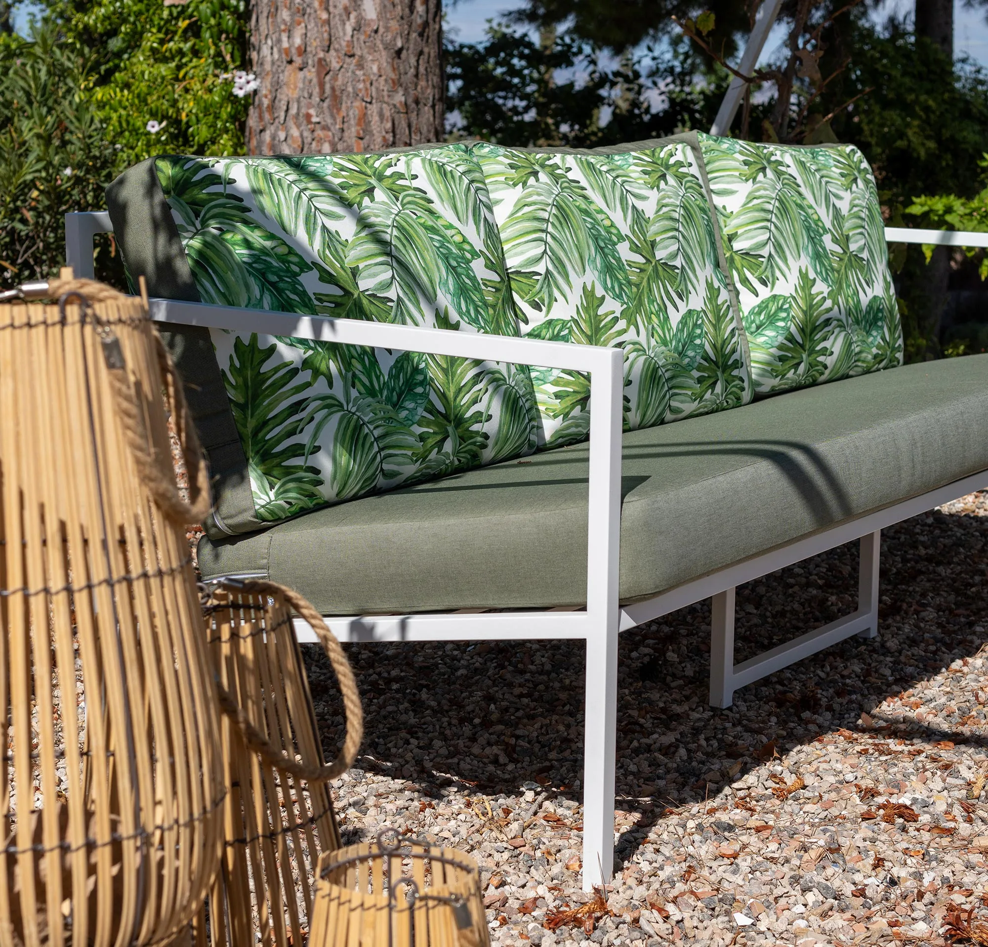 - 1 Sofá de terraza de 3 plazas con cojines de exterior desenfundables. Dimensiones (Ancho-Fondo-Alto): 195 x 82 x 77 cm.