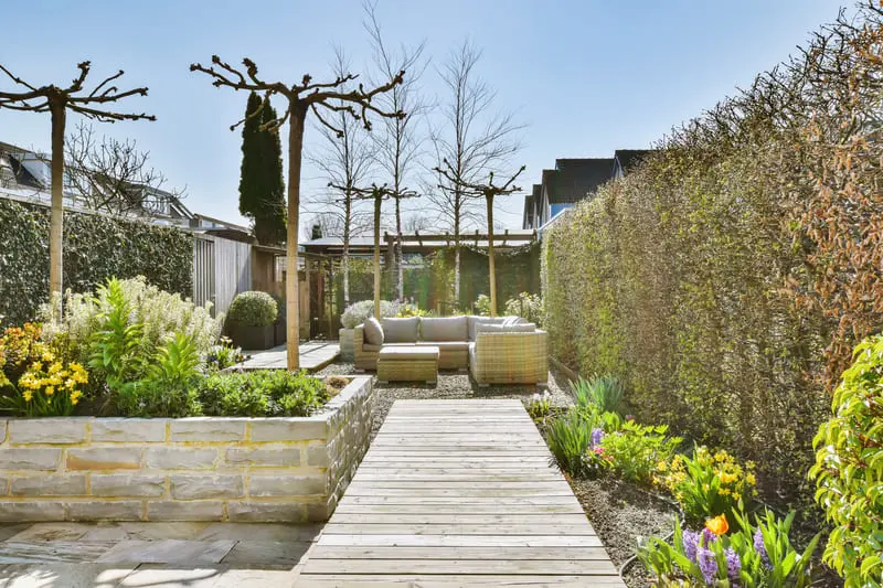 Si prefieres una estética limpia, los jardines modernos y minimalistas son ideales para espacios pequeños. Este estilo apuesta por líneas rectas y una paleta de colores neutros: blanco, gris, verde profundo. Para el mobiliario, lo ideal son bancos de aluminio, sillas de diseño ligero de fibra sintética, y mesas auxiliares minimalistas que no roben protagonismo al entorno.