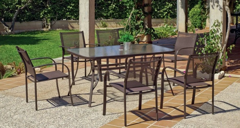 mesa de comedor desmontable para jardín fabricada de acero lacado en color bronce MacaoMesa de patio: modelo Macao 150