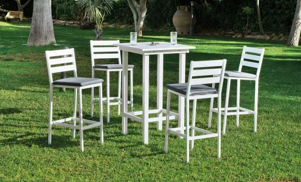 La mesa alta y blanca de exterior tiene un tablero formado por lamas de aluminio y reforzado con un remarco interior para dotarle de consistencia y fuerza. Puedes probar a combinar esta mesa alta de jardín con nuestro taburete Tropea.