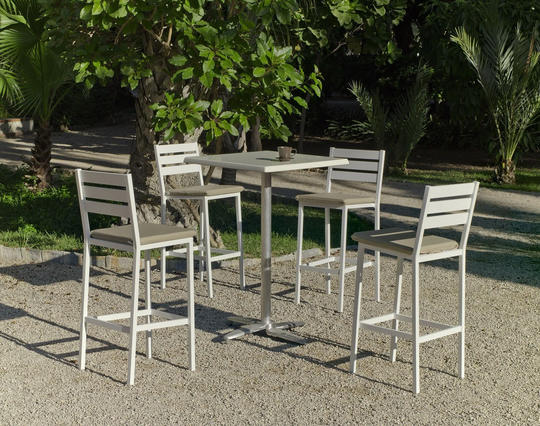 En la fabricación de esta mesa alta de bar exterior se han utilizado las mejores materias primas que la hacen muy resistente y duradera. Estructura reforzada y ligera de aluminio y tablero de Werzalit de color blanco. Pintura con textura poliéster Qualicon de gran calidad y de alta resistencia al salitre, rayas o golpes gracias a los procesos de cocción.