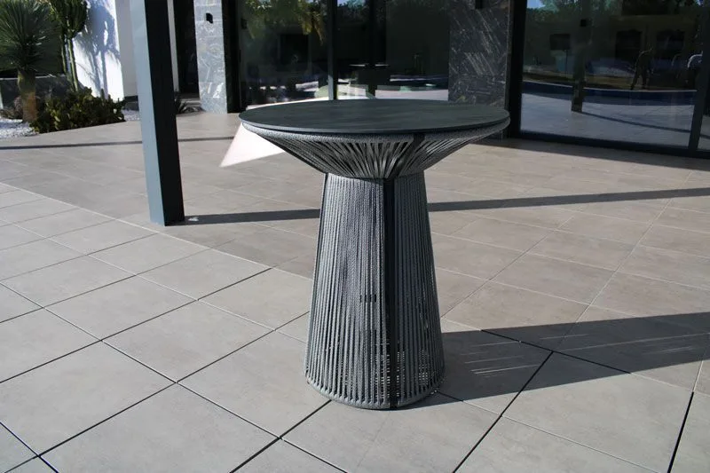 La estructura de esta mesa redonda alta para jardín, está revestida de cuerda trenzada de color champagne, azul, blanco o gris antracita. Se trata de una cuerda indeformable e irrompible, resistente a cualquier temperatura. No pierde su forma ni color y está diseñada 100% para su uso en exterior.