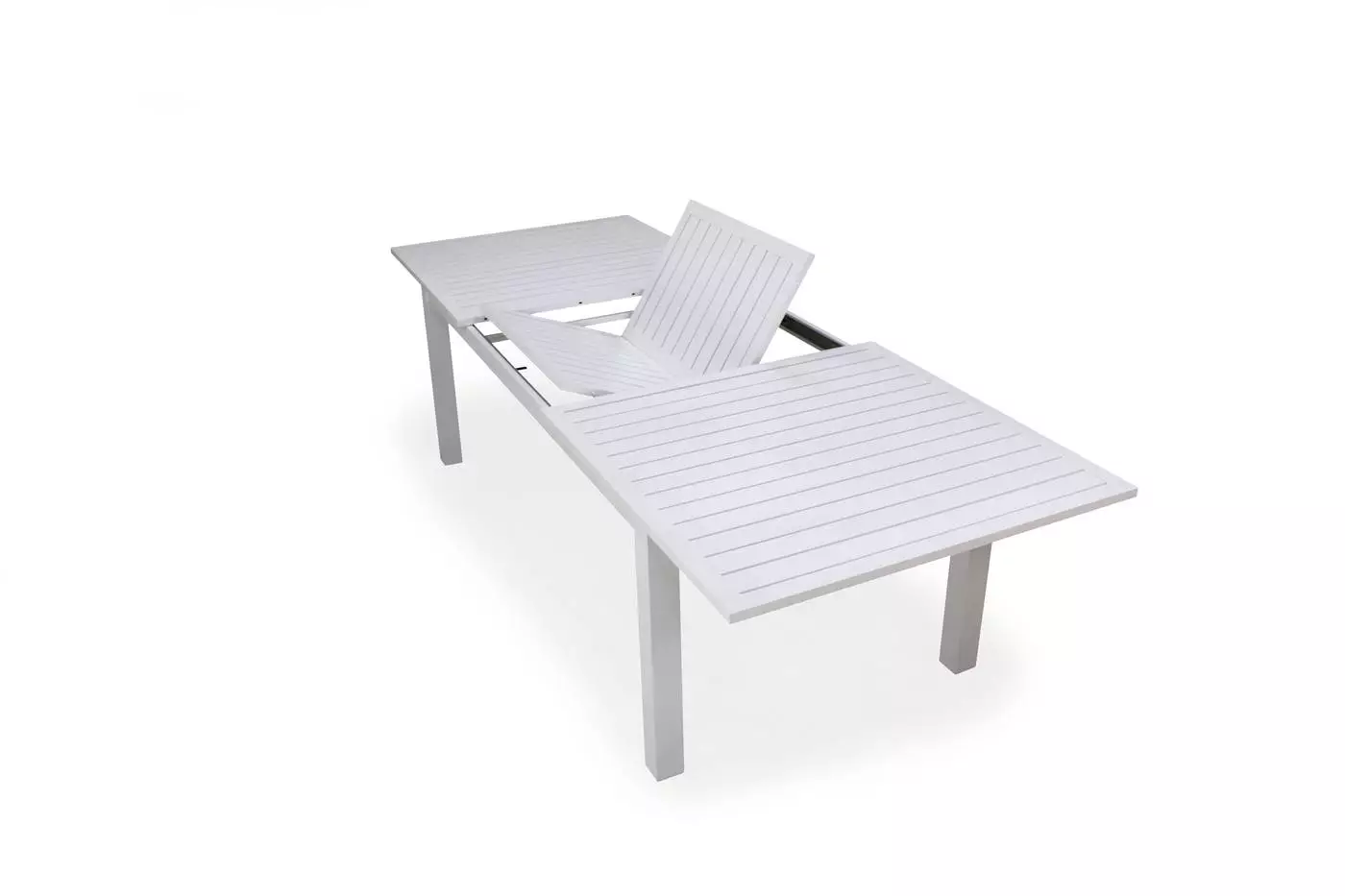 Su limpio y original diseño, otorgan a esta mesa de comedor modernidad y elegancia. Diseñada para soportar las condiciones adversas como el sol y la lluvia, así como los rigores del uso diario. Aquí queda fotografiada la mesa de jardín blanca extensible, fabricamos la estructura en seis colores distintos; champán, plata, marrón, blanco, negro y gris antracita.