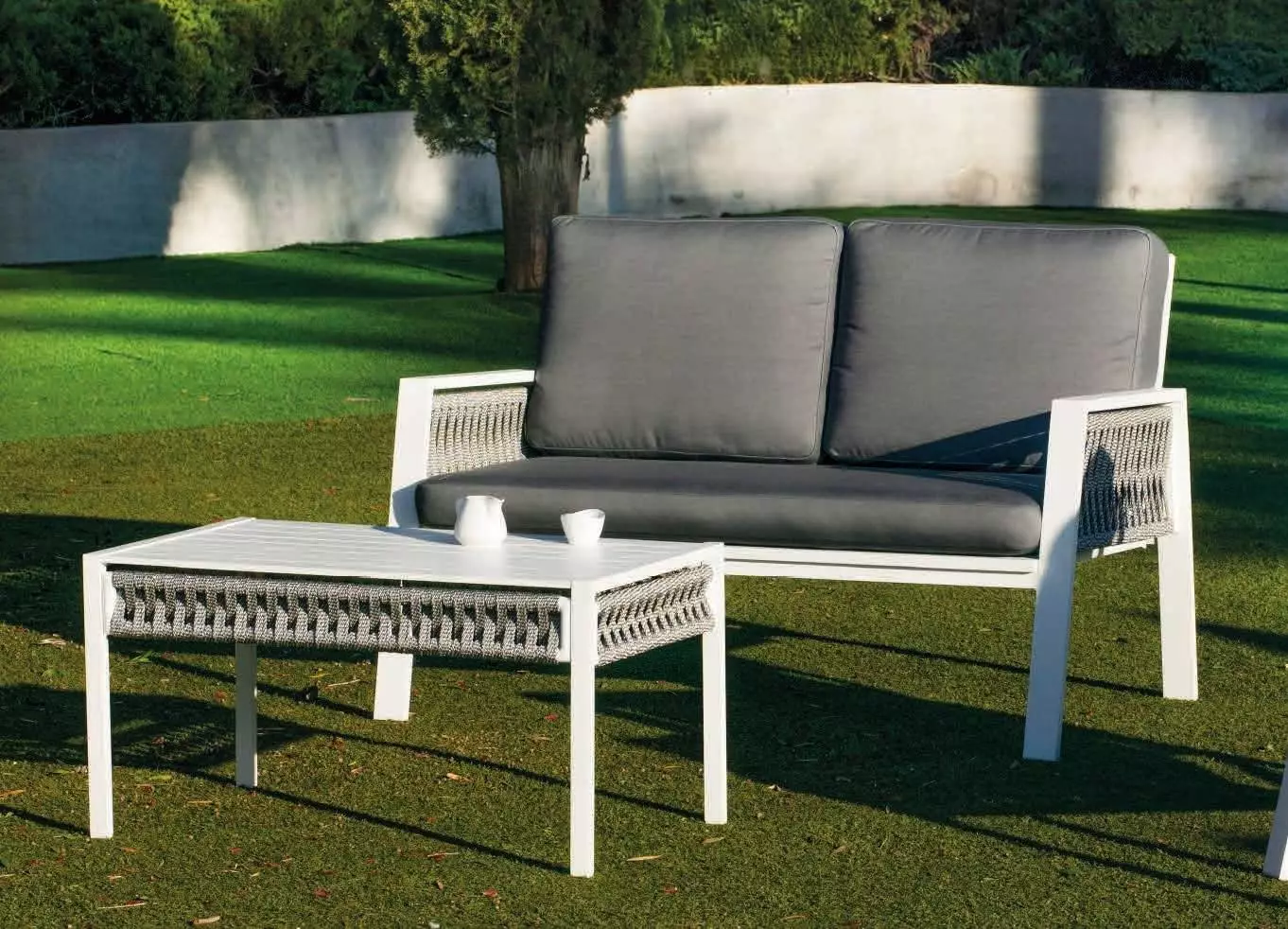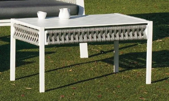 Elegante y funcional mesa baja rectangular fabricada en aluminio y cuerda trenzada modelo Alhambra, que te ofrecerá un lugar relajado y cómodo para que puedas disfrutar del tiempo libre con tu familia y amigos.