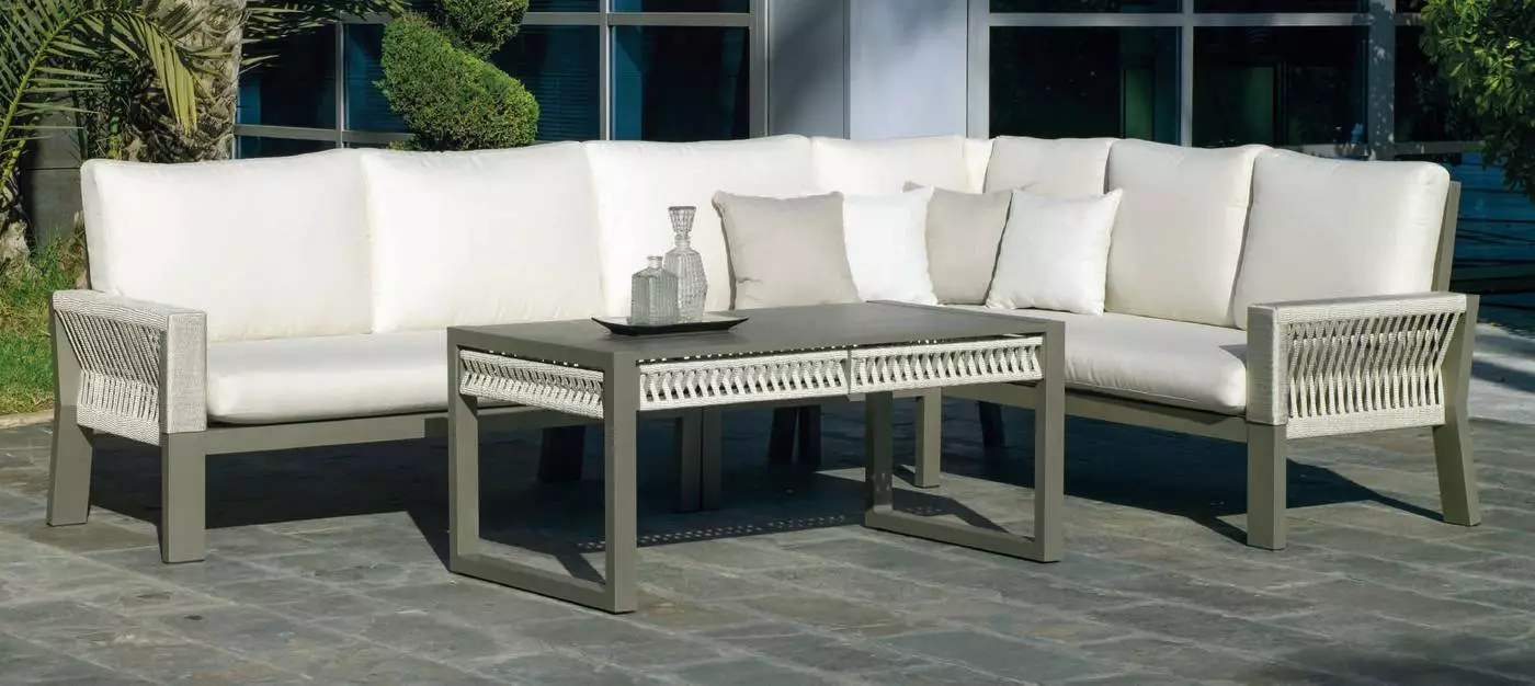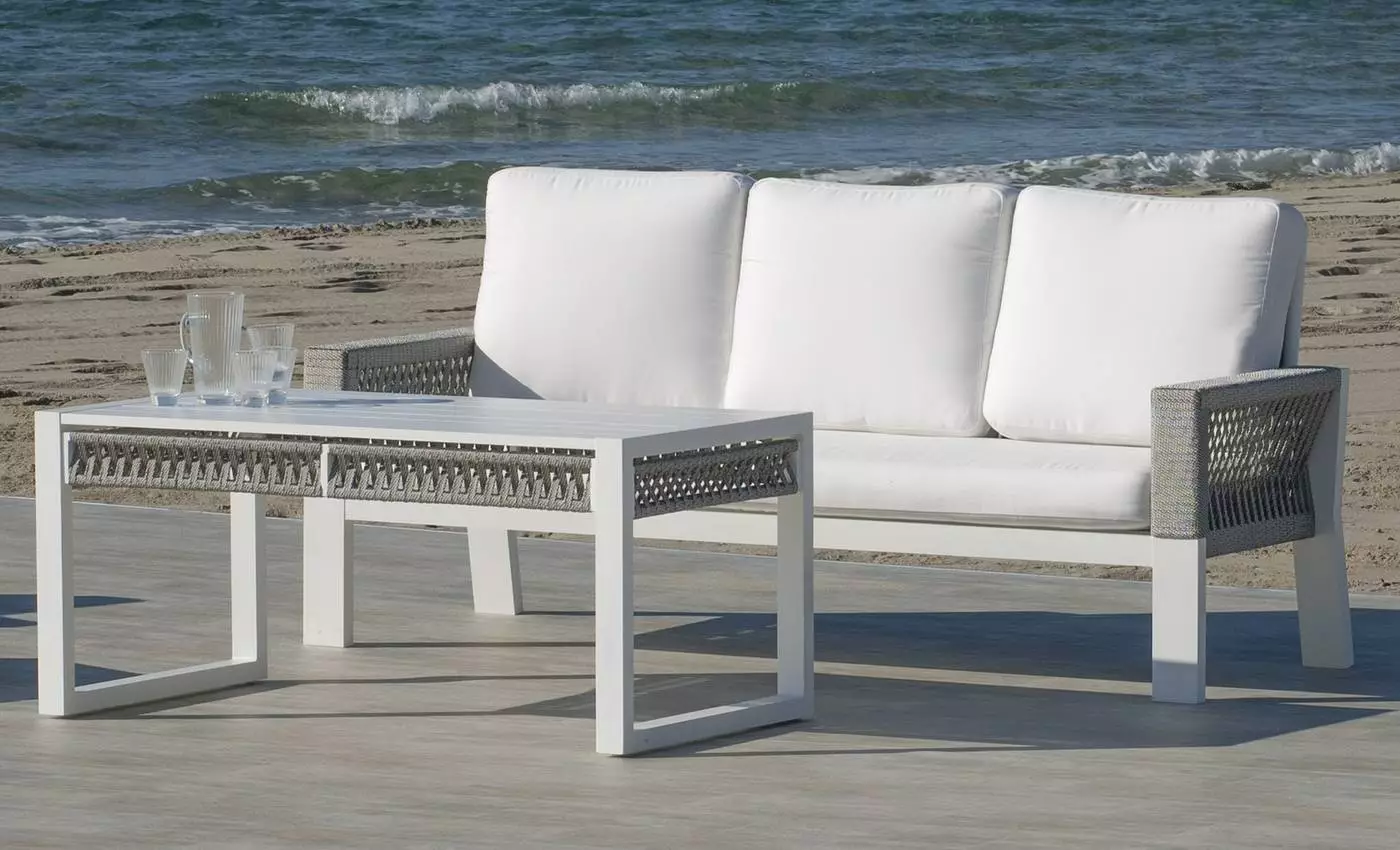La estructura de esta mesa se complementa con unos elegantes detalles de cuerda trenzada en color champagne, azul, blanco o gris antracita. Se trata de una cuerda indeformable e irrompible, resistente a cualquier temperatura. No pierde su forma ni color y está diseñada 100% para su uso en exterior.