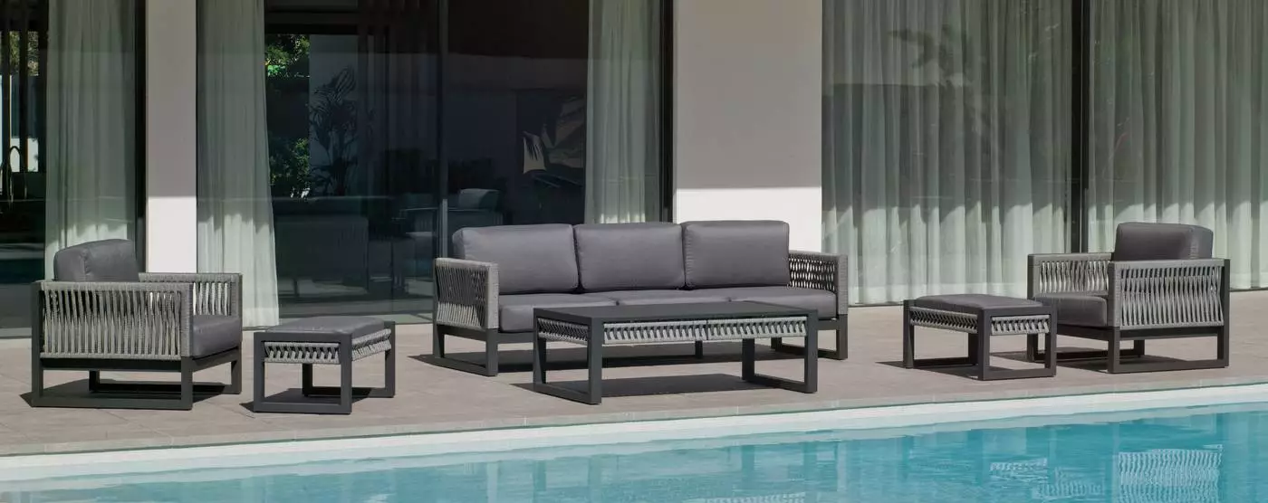 La estructura de esta mesa se complementa con unos elegantes detalles de cuerda trenzada en color champagne, azul, blanco o gris antracita. Se trata de una cuerda indeformable e irrompible, resistente a cualquier temperatura. No pierde su forma ni color y está diseñada 100% para su uso en exterior.