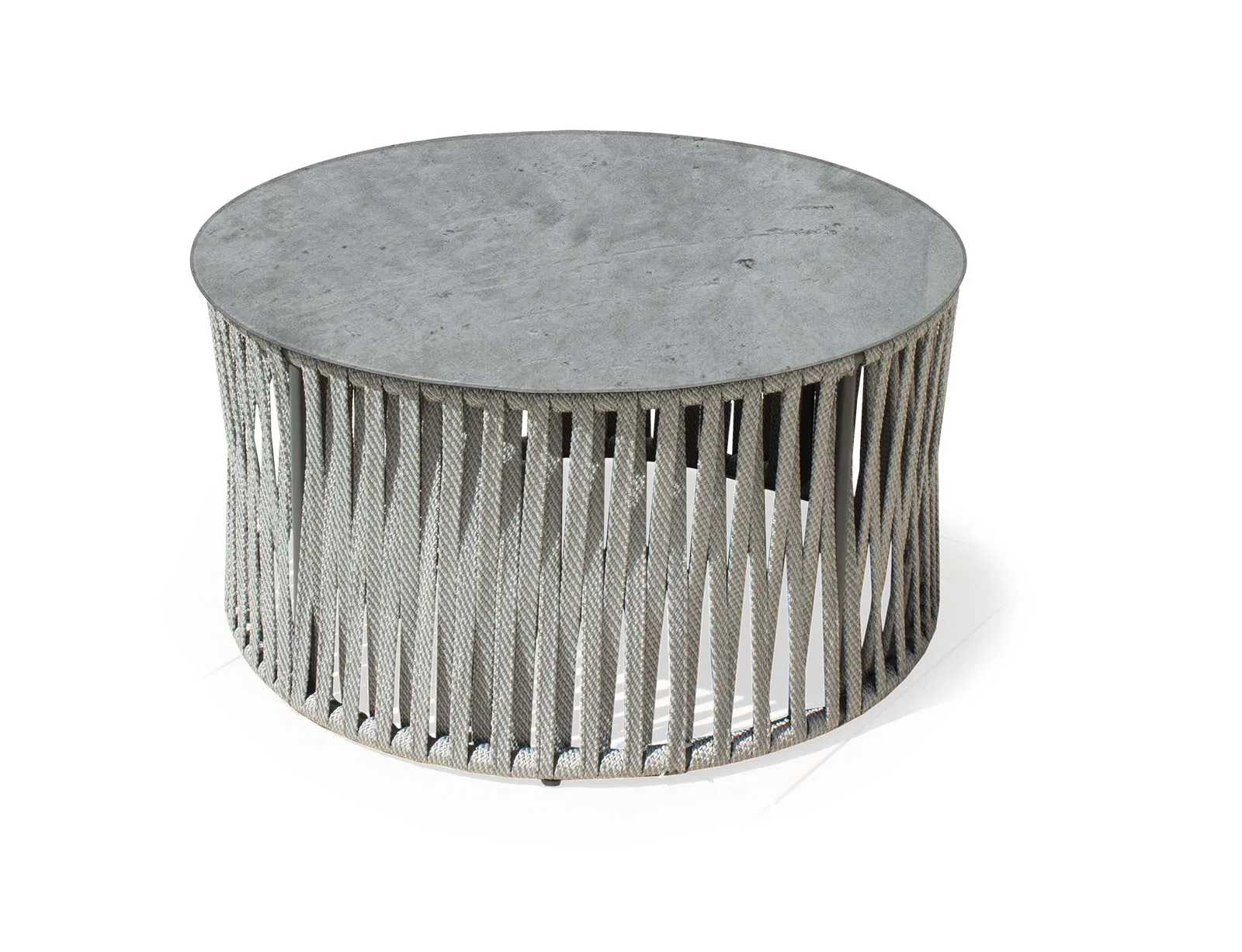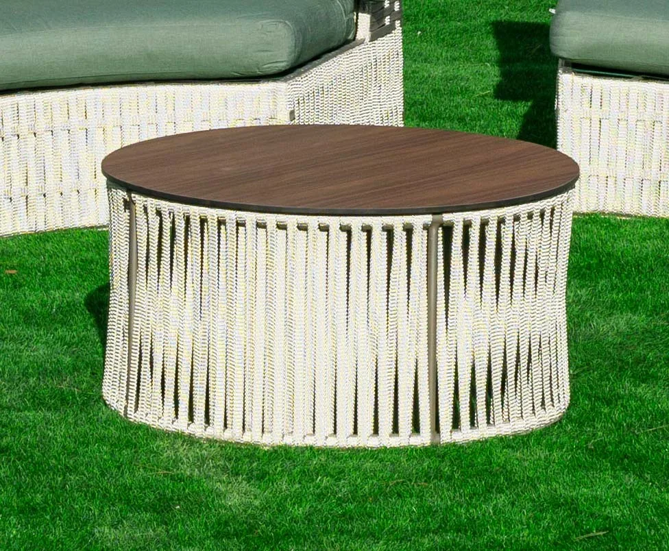Descubre la belleza de nuestra mesa baja redonda, perfecta para jardines. Fabricada con una estructura de aluminio resistente, se complementa con unos elegantes detalles de cuerdas trenzadas en color champagne, azul, blanco o gris antracita. Se trata de una cuerda indeformable e irrompible, resistente a cualquier temperatura. No pierde su forma ni color y está diseñada 100% para su uso en exterior, esta mesa no solo es funcional, sino también una obra de arte. Su diseño único aporta un toque contemporáneo y natural a cualquier espacio exterior.