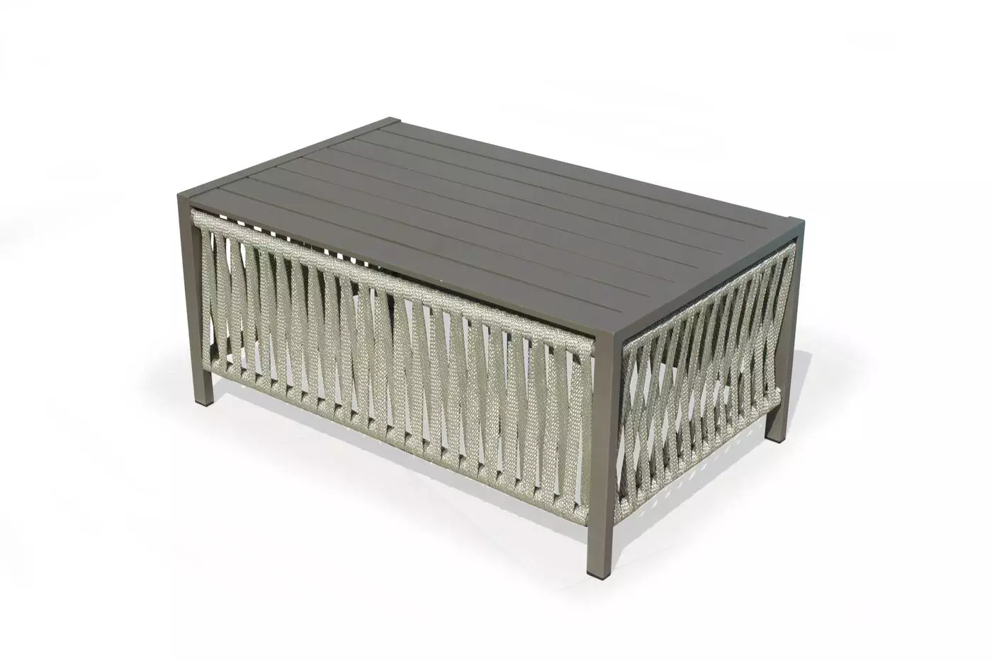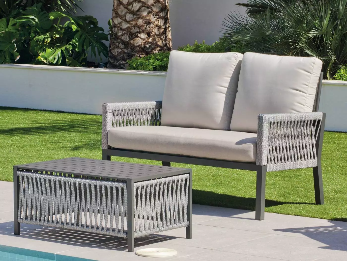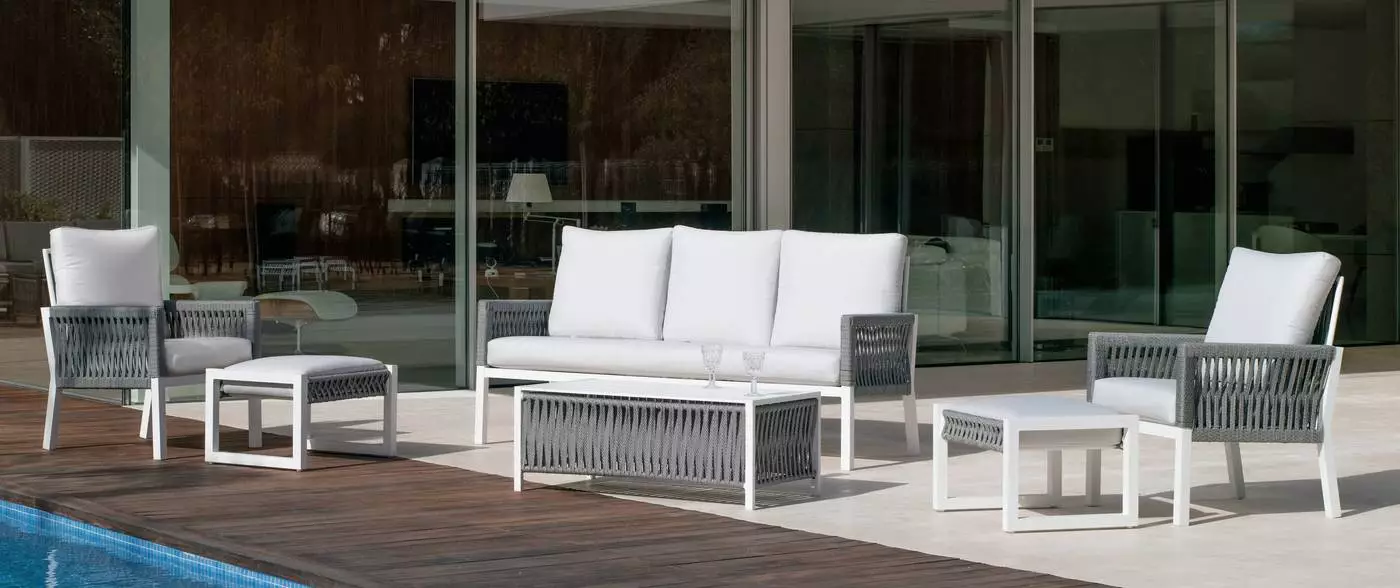 La estructura de esta mesa se complementa con unos elegantes detalles de cuerdas trenzadas en color champagne, azul, blanco o gris antracita. Se trata de una cuerda indeformable e irrompible, resistente a cualquier temperatura. No pierde su forma ni color y está diseñada 100% para su uso en exterior.