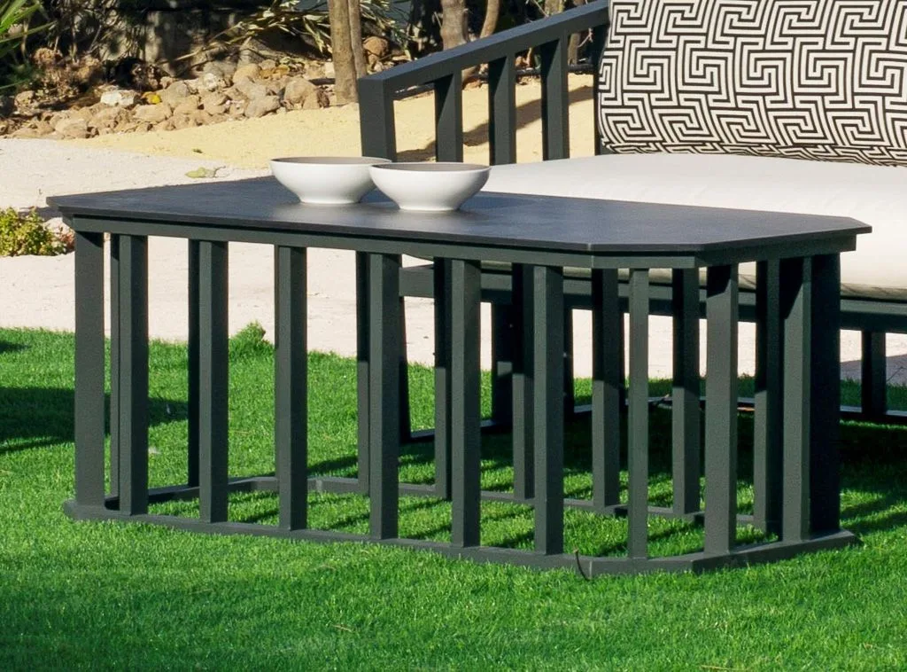 Mesa de centro rectangular para exterior Birmania con estructura de aluminio reforzada y ligera, con acabados en color blanco o gris antracita.