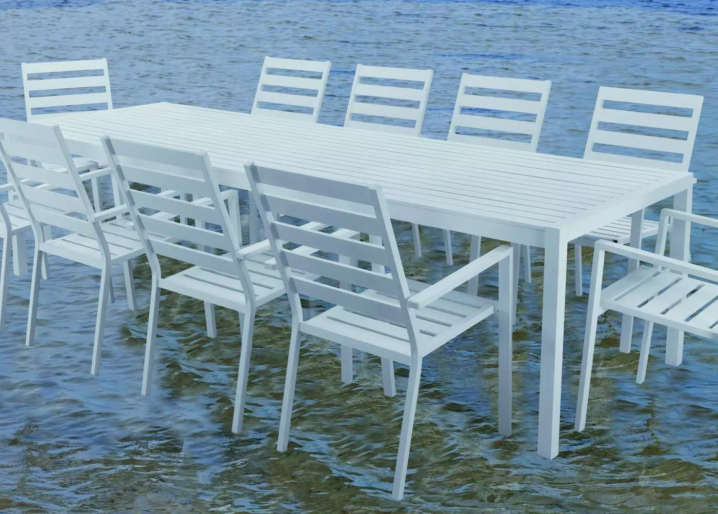 En la fabricación de esta mesa se han utilizado las mejores materias primas que la hacen muy resistente y duradera. Estructura y uniones fabricadas en aluminio extrusado de alta calidad y no reciclado. Los tubos de aluminio que la forman están perfectamente lijados para eliminar cualquier imperfección o irregularidad en las juntas. Así mismo, dichos tubos están especialmente pulidos para abrir los poros del aluminio y facilitar la fijación de la pintura. Las patas llevan tacos de goma para evitar rallar el suelo y reducir el ruido producido con el movimiento. La tapa de la mesa de comedor exterior para 10 personas está formada con un tablero de lamas de aluminio.
