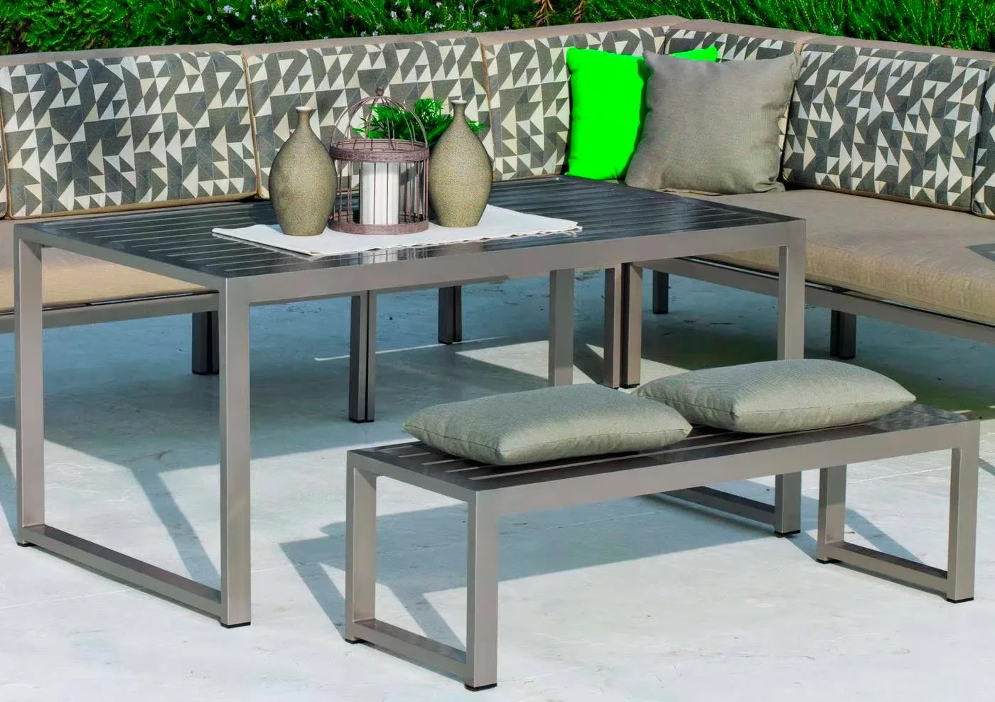 La mesa alta para sofá está diseñada en forma rectangular, ofreciendo espacio suficiente para acomodar a tus invitados con comodidad. Su tamaño adecuado permite acomodar 6 sillas alrededor de la mesa, proporcionando un espacio acogedor para disfrutar de comidas al aire libre, reuniones sociales y momentos relajados en el jardín. La tapa está formada con tablero lamas de aluminio. Está disponible en varios colores de estructura de aluminio.
